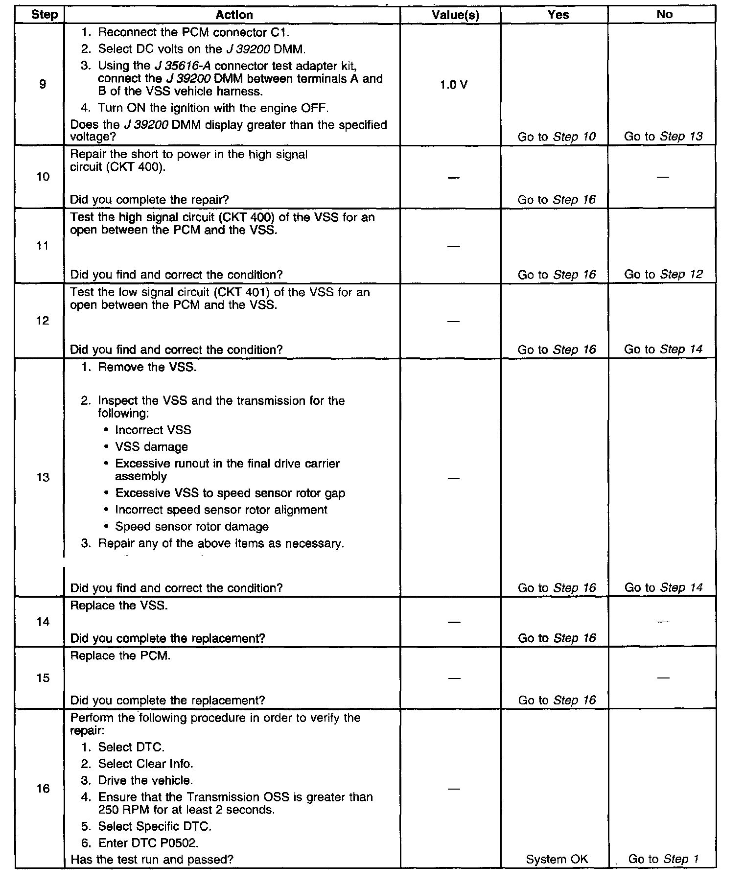 The vehicle speed sensor (VSS) system is a pulse generator consisting of a speed sensor assembly, located in the case extension, and a toothed vehicle speed sensor reluctor wheel, which is pressed onto the final drive carrier assembly. As the vehicle drives forward, the vehicle speed sensor reluctor wheel rotates. This rotation produces a variable AC signal in the pickup coil that is proportional to vehicle speed. The PCM uses this signal in order to calculate vehicle speed, shift timing and gear ratios. If the PCM detects a low vehicle speed with a high engine speed while in a drive range, then DTC P0502 sets. DTC P0502 is a type B DTC.
