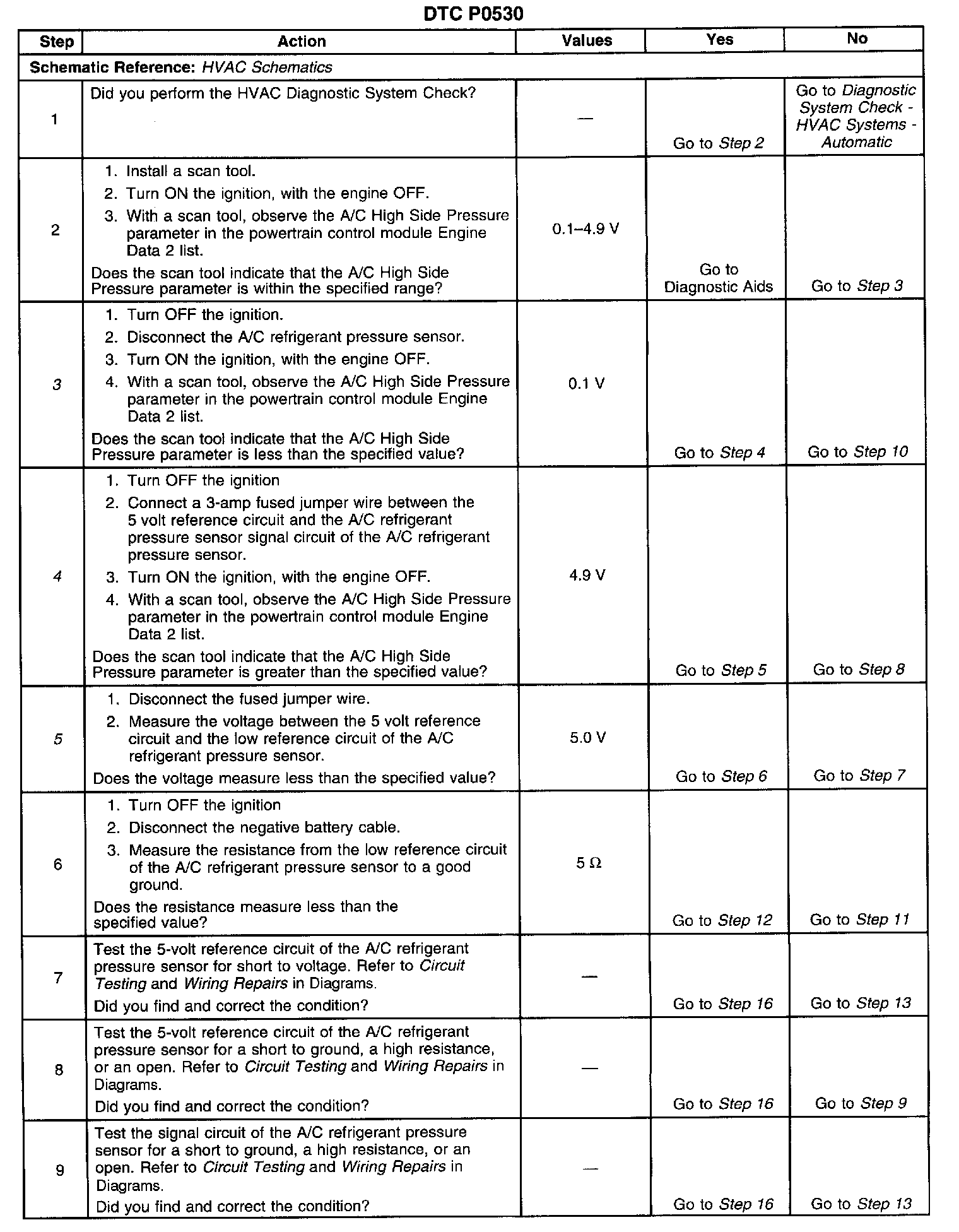 CIRCUIT DESCRIPTIONThe Powertrain Control Module (PCM) monitors the high side refrigerant pressure via the A/C refrigerant pressure sensor. The PCM applies a 5.0 volt reference and a low reference (ground) to the sensor. Changes in the A/C refrigerant pressure cause the A/C refrigerant pressure sensor signal to the PCM to vary. When the pressure is high the signal voltage is high. When the pressure is low the signal voltage is low. When pressure is high the PCM commands the cooling fans on. When pressure is too high or too low the PCM will not allow the A/C compressor clutch to engage. When the DTC is set, the PCM does not allow the A/C compressor clutch to engage. This is done to protect the compressor.
