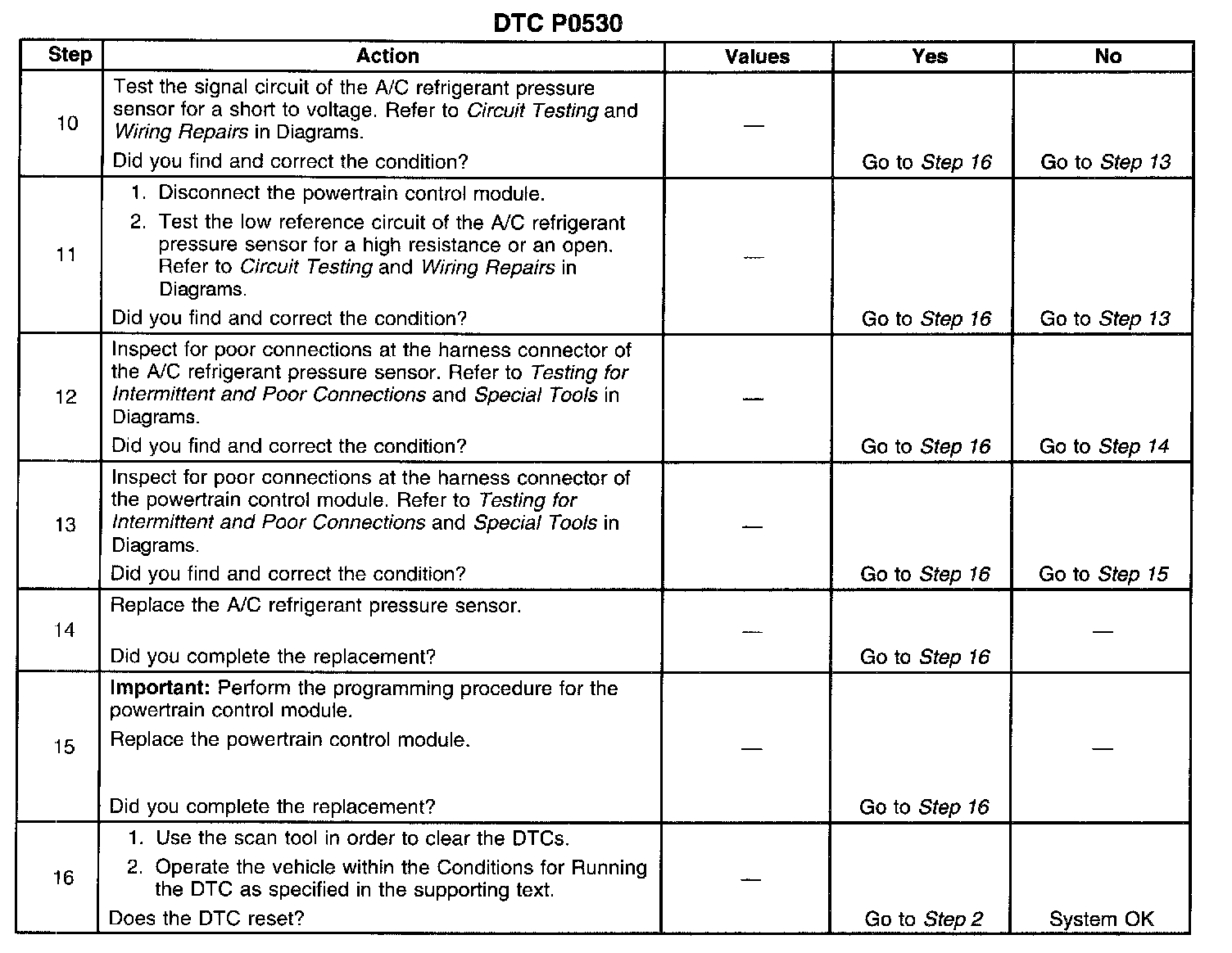 If DTC P0530 cannot be duplicated reviewing the Failure Records vehicle mileage since the diagnostic test last failed may help determine how often the condition that caused the DTC to set occurs. This may assist in diagnosing the condition.