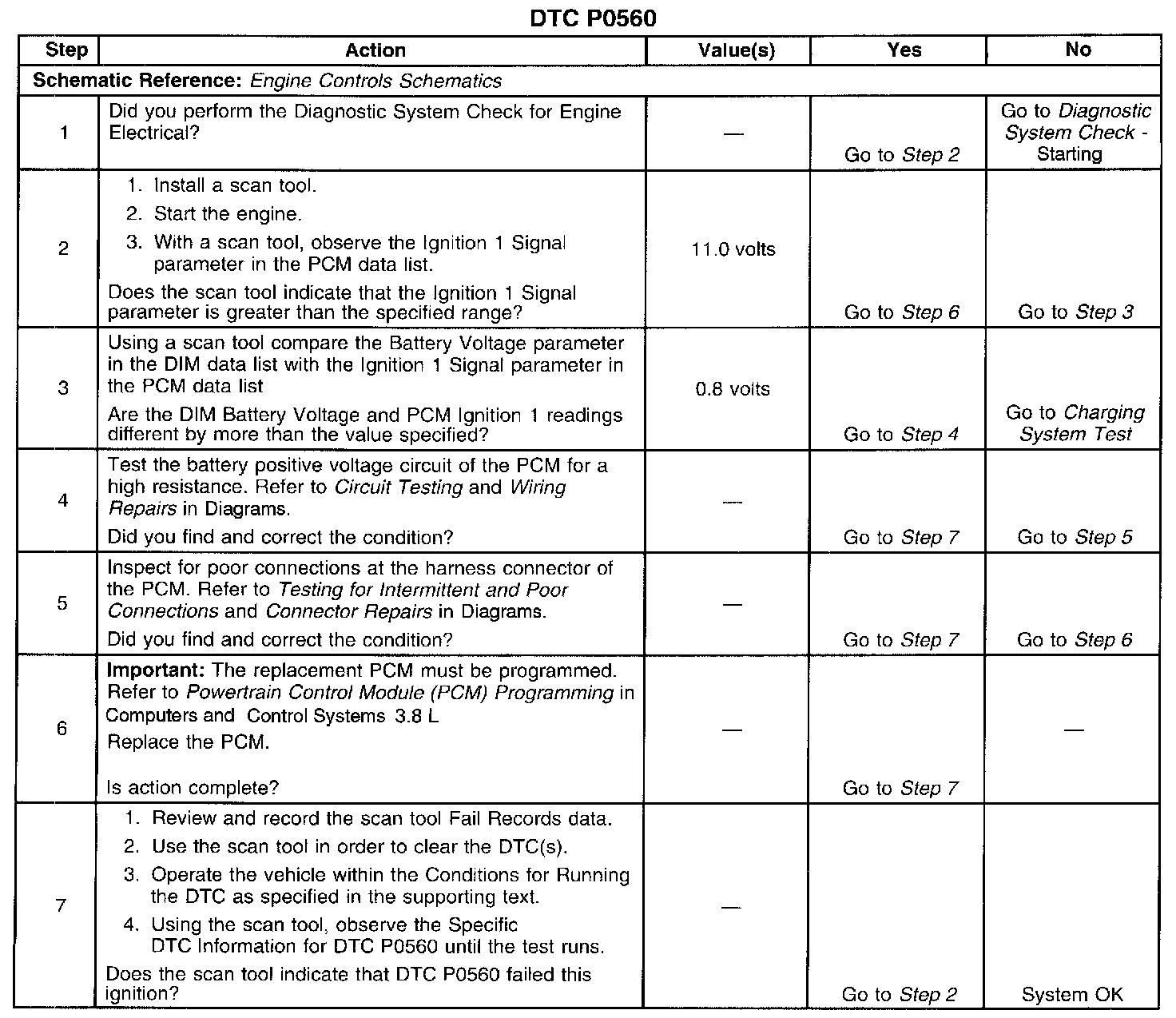 CIRCUIT DESCRIPTIONThe PCM monitors the system voltage to make sure that the voltage stays within the proper range. Damage to components, and incorrect data input can occur when the voltage is out of range. The PCM monitors the system voltage over an extended length of time. If the PCM detects a system voltage outside an expected range for the calibrated length of time, DTC P0560 will set.
