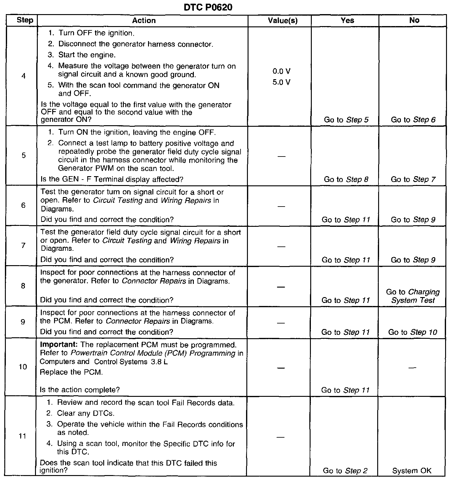 CIRCUIT DESCRIPTIONThe Powertrain Control Module (PCM) uses the generator turn on signal circuit to control the generator. A high side driver within the PCM allows the PCM to turn the generator ON and OFF. When Generator operation is desired, the PCM sends a 5 volt signal to the voltage regulator via the generator turn on signal circuit. This causes the voltage regulator to begin controlling the generator field circuit. Once the Generator is enabled by the PCM, the voltage regulator controls generator output independently of the PCM. Under certain operating conditions, the PCM can turn Off the generator by turning Off the 5 volt signal on the generator turn on signal circuit. The PCM has fault detection circuitry which monitors the state of the generator turn on signal circuit. If the fault detection circuit senses a voltage other than what is expected, this DTC will set. The voltage regulator also contains fault detection circuitry. If the regulator detects a problem, the regulator will ground the generator turn on signal circuit, pulling the voltage low. This also causes the PCM to set the DTC.