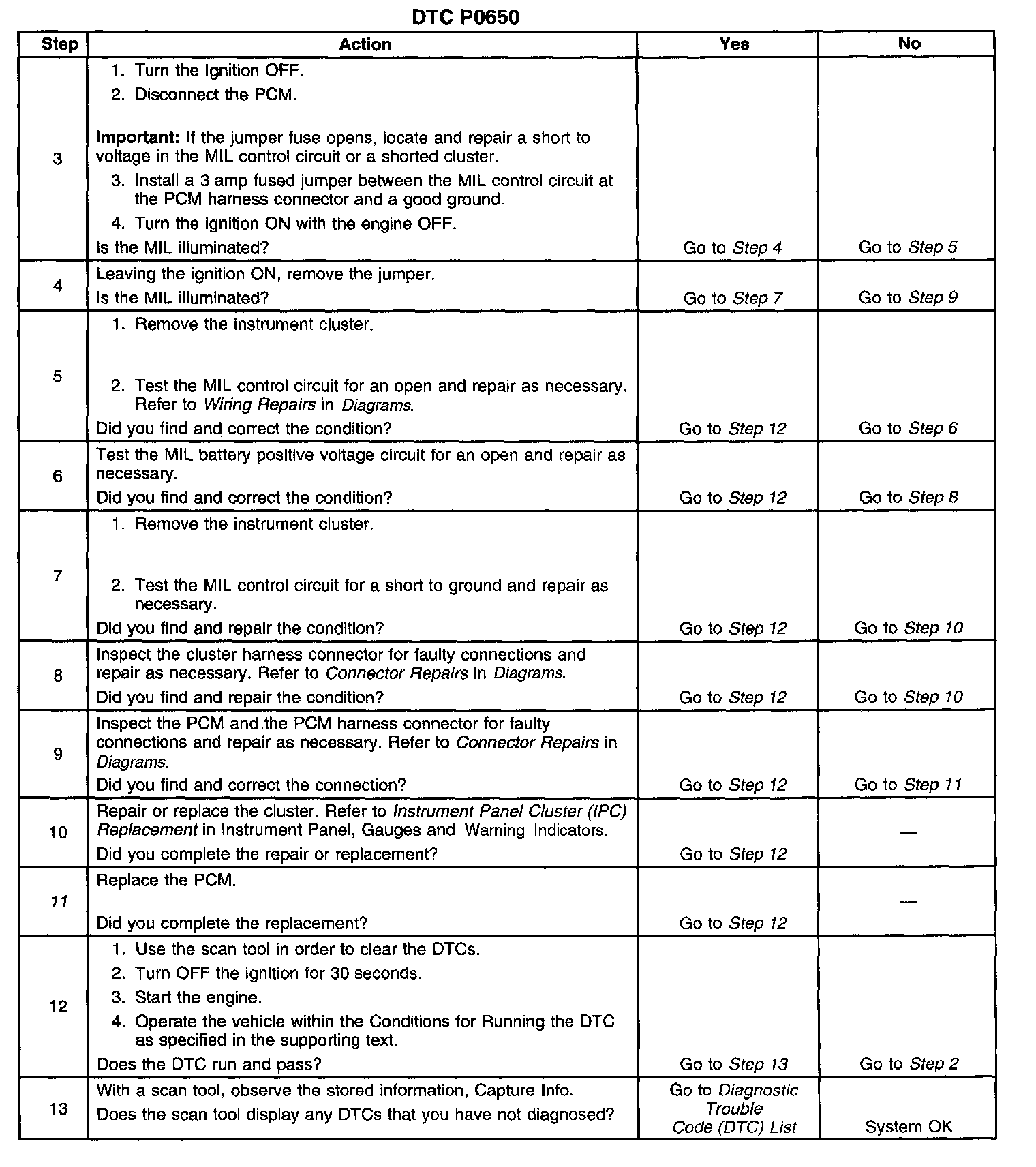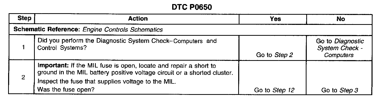 CIRCUIT DESCRIPTIONOutput Driver Modules (ODMs) are used by the Powertrain Control Module (PCM) to turn ON many of the current-driven devices that are needed to control various engine and transaxle functions. Each ODM is capable of controlling up to 7 separate outputs by applying ground to the device which the PCM is commanding ON. Unlike the Quad Driver Modules (QDMs) used in prior model years, ODMs have the capability of diagnosing each output circuit individually. DTC P0650 set indicates an improper voltage level on the output circuit that controls the Malfunction Indicator Lamp (MIL).