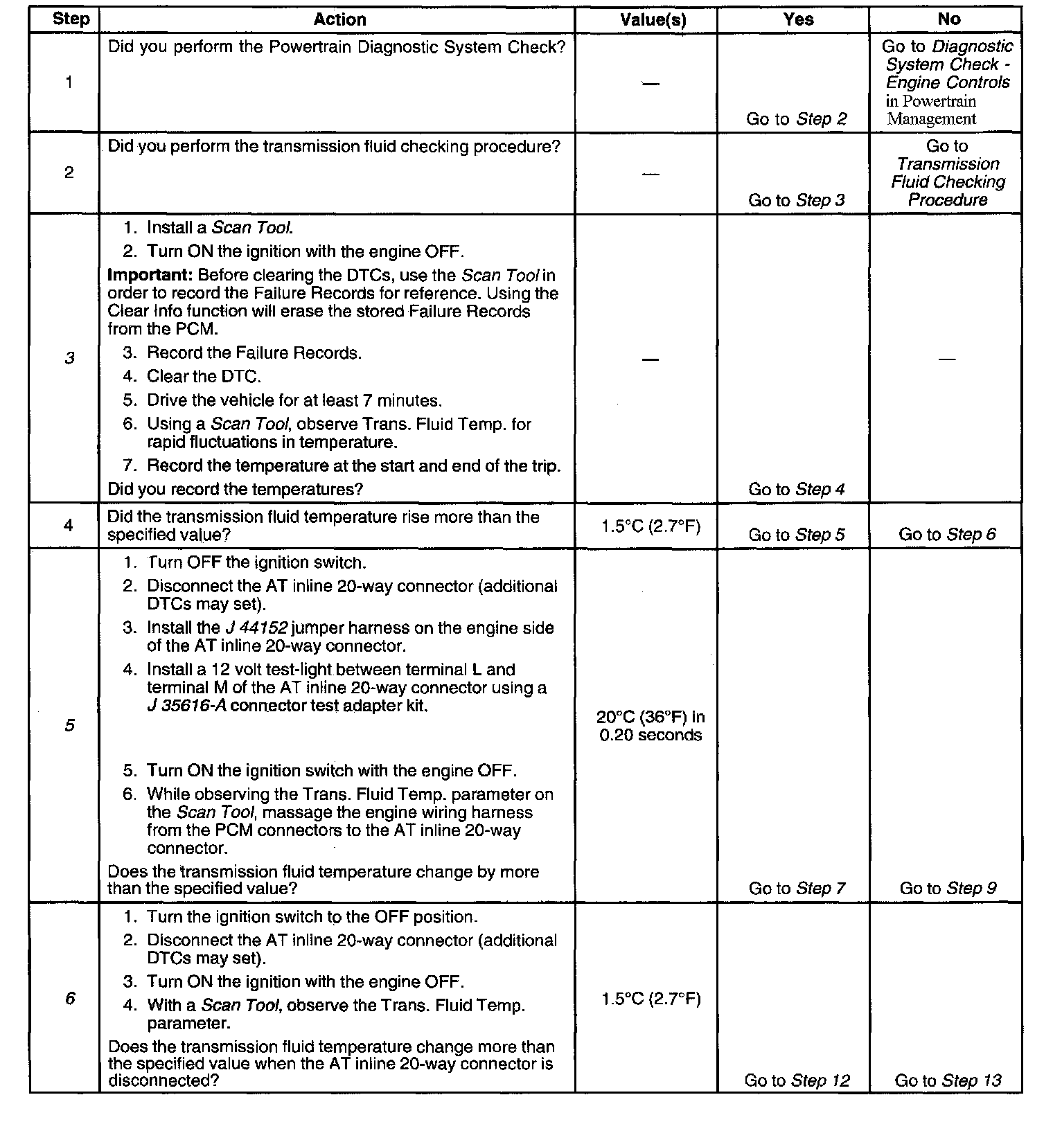 The change in transmission fluid temperature is greater than 20°C (36°F) within 0.2 seconds and this occurs at least 14 times within 7 seconds.