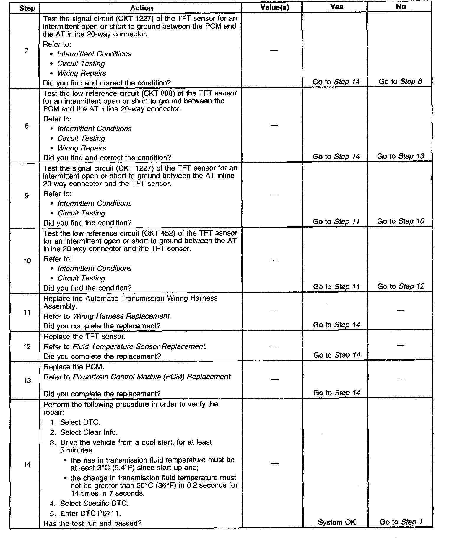 The automatic transmission fluid temperature (TFT) sensor is a negative coefficient thermistor. When the transmission fluid is cold, the sensor resistance is high. As the transmission fluid warms up, the sensor resistance decreases. This diagnostic monitors the TFT sensor circuit. The circuit may be functional but not in the normal operating range. This diagnostic indicates stuck, erratic, intermittent, or skewed values, resulting in reduced system performance. The TFT sensor range is -40°C to +151°C (-40°F to +304°F). If the PCM detects an intermittent voltage or no voltage change in the TFT sensor circuit, then DTC P0711 sets. DTC P0711 is a type C DTC.