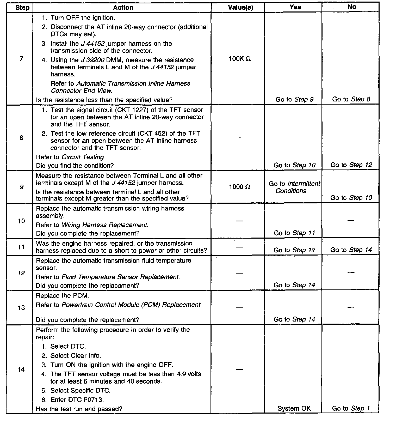 The automatic transmission fluid temperature (TFT) sensor is a negative coefficient thermistor whose resistance value changes based on temperature. The PCM provides a 5 volt reference to the sensor. A low fluid temperature, an open TFT sensor or sensor circuit results in high signal voltage. The TFT operating range is -40°C to +151°C (-40°F to +304°F). If the PCM detects a continuous open or a short to power on the TFT sensor circuit, then DTC P0713 sets. DTC P0713 is a type C DTC.