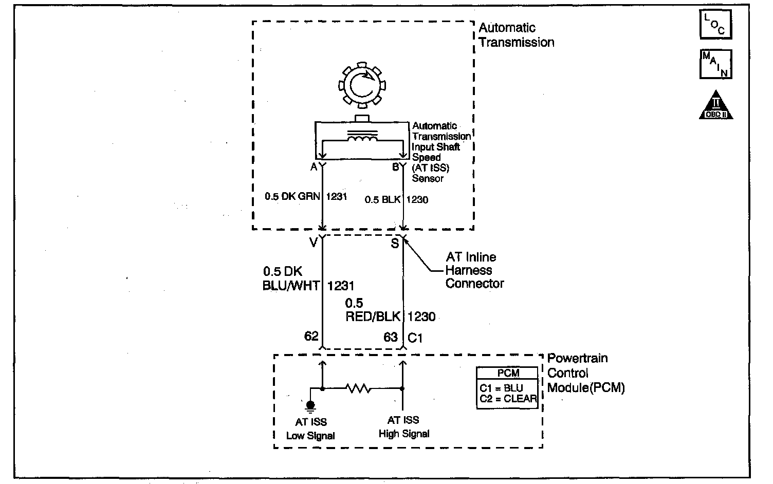There is a fixed air gap between the sensor and the teeth on the sensor reluctor wheel. The AT ISS sensor input is used by the PCM in order to control line pressure, TCC apply and release and transmission shift patterns. This sensor is also used to calculate the appropriate gear ratios and TCC slippage.