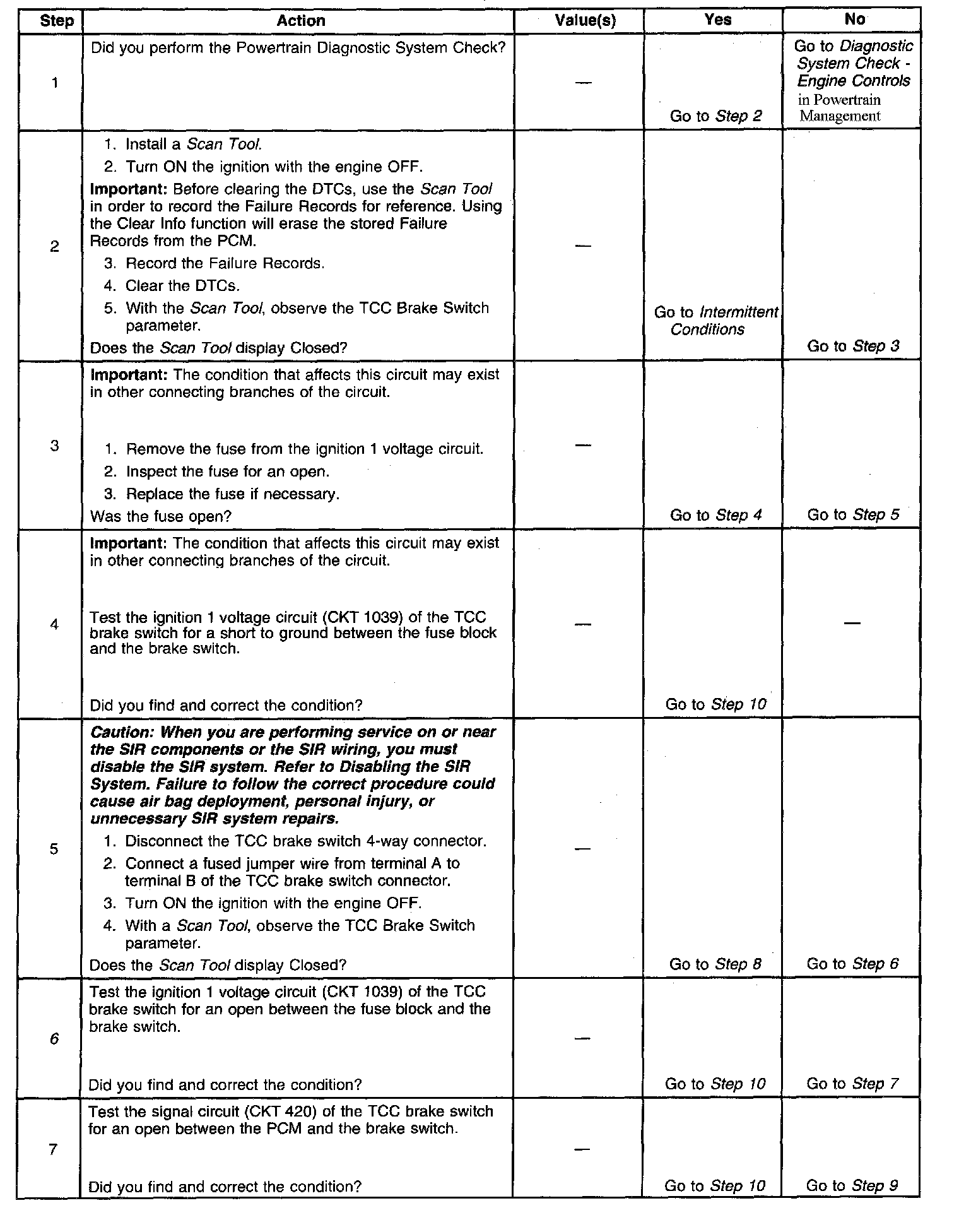 6. This step isolates the fault between the TCC brake switch and the harness.