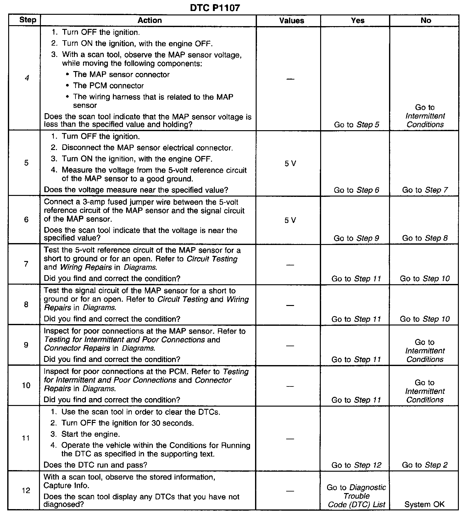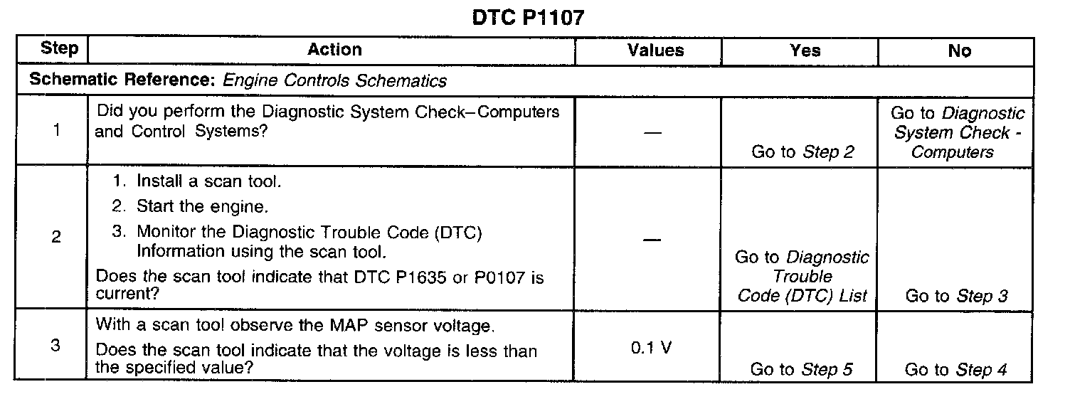 If the PCM detects a MAP sensor signal voltage that is intermittently low, DTC P1107 will set.