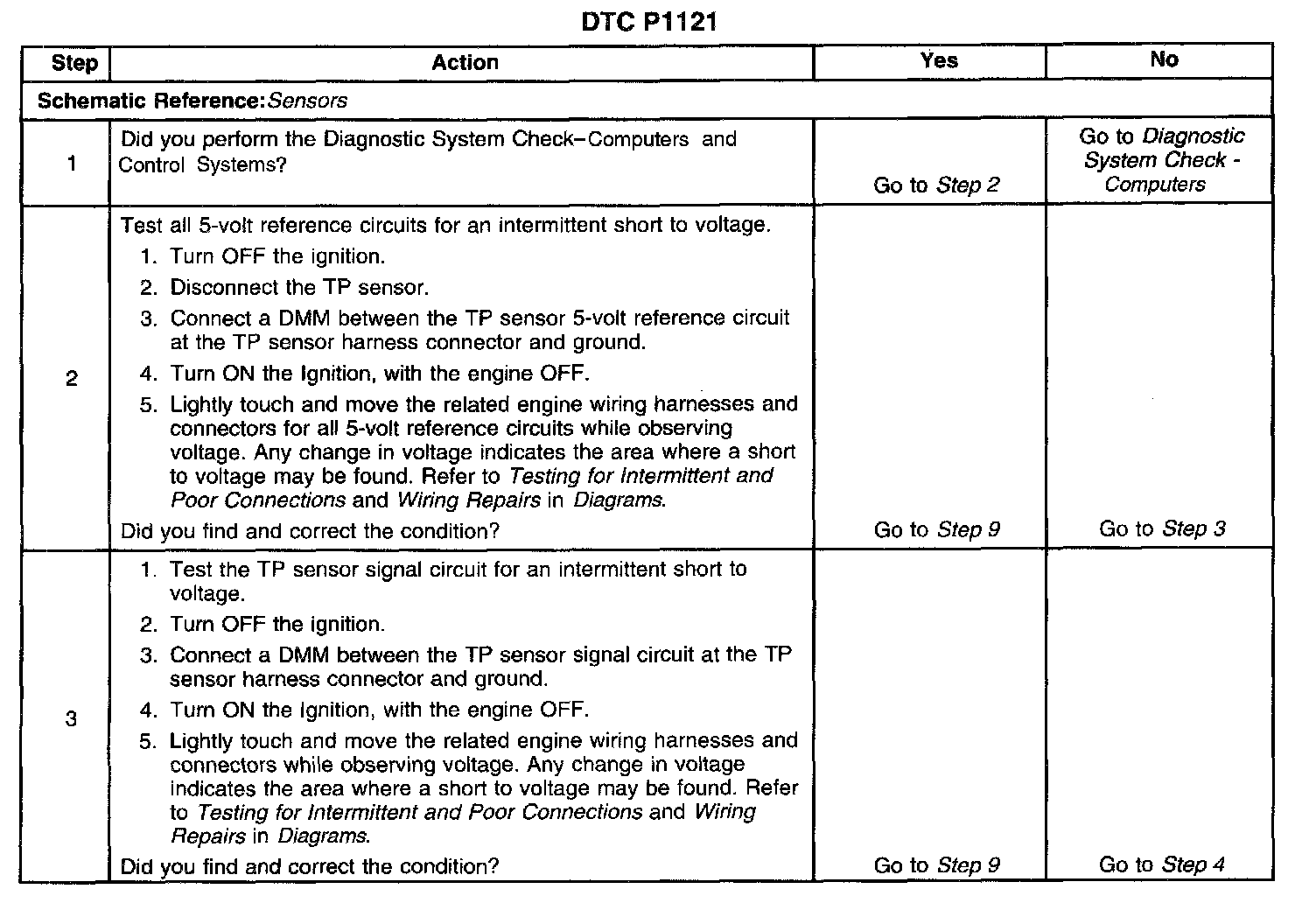 CIRCUIT DESCRIPTIONThe Throttle Position (TP) sensor is used by the Powertrain Control Module (PCM) to determine the throttle plate angle for various engine management systems. The TP sensor is a potentiometer type sensor with 3 circuits: a 5-volt reference circuit, a low reference circuit, and a signal circuit. Rotation of the TP sensor rotor from the closed throttle position to the Wide Open Throttle (WOT) position provides the PCM with a signal voltage from below 1 volt to greater than 4 volts through the TP sensor signal circuit. If the PCM detects an intermittent excessively high signal voltage, this DTC will set.