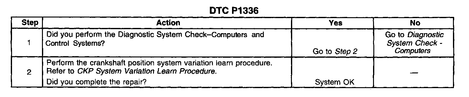 The crankshaft position system variation values are stored in the PCM non-volatile memory after a learn procedure has been performed. If the crankshaft position system variation values have not been stored in the PCM, DTC P1336 will set. The learn procedure is required after the following service procedures have been performed: