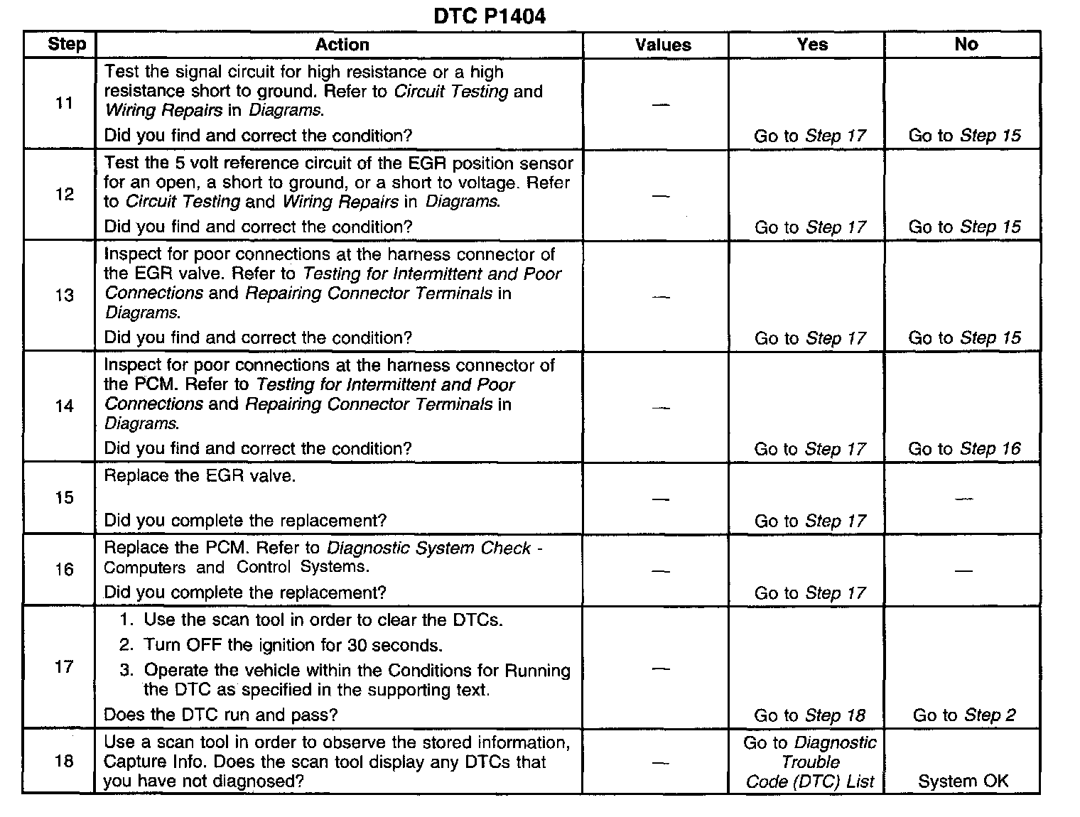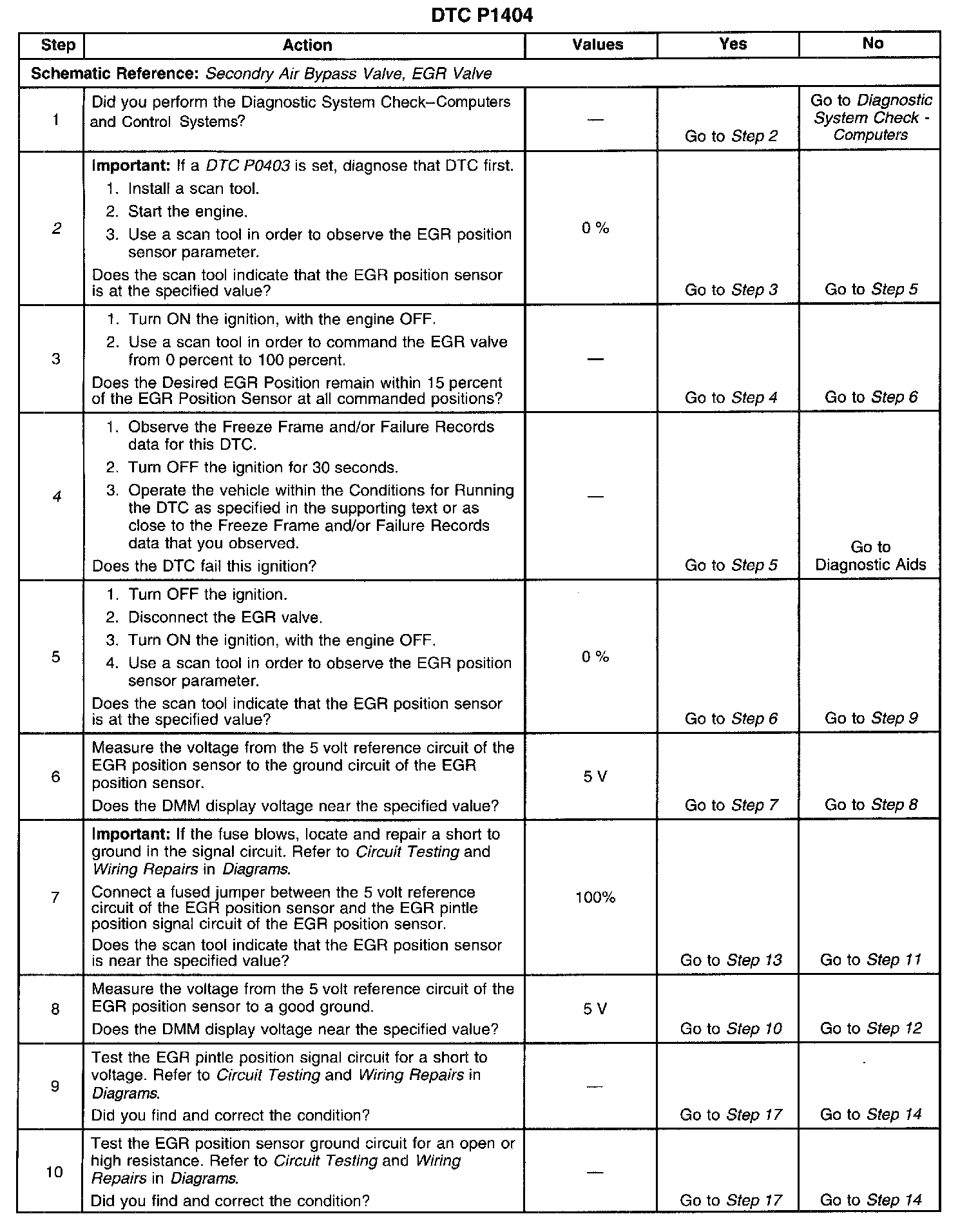 4. If DTC P1404 will only set under certain conditions, the malfunction may be intermittent. Refer to Diagnostic Aids. If an intermittent wiring condition is not present, test for a faulty connection at the PCM or the EGR valve. If the connections are OK and DTC P1404 continues to set, replace the EGR valve.