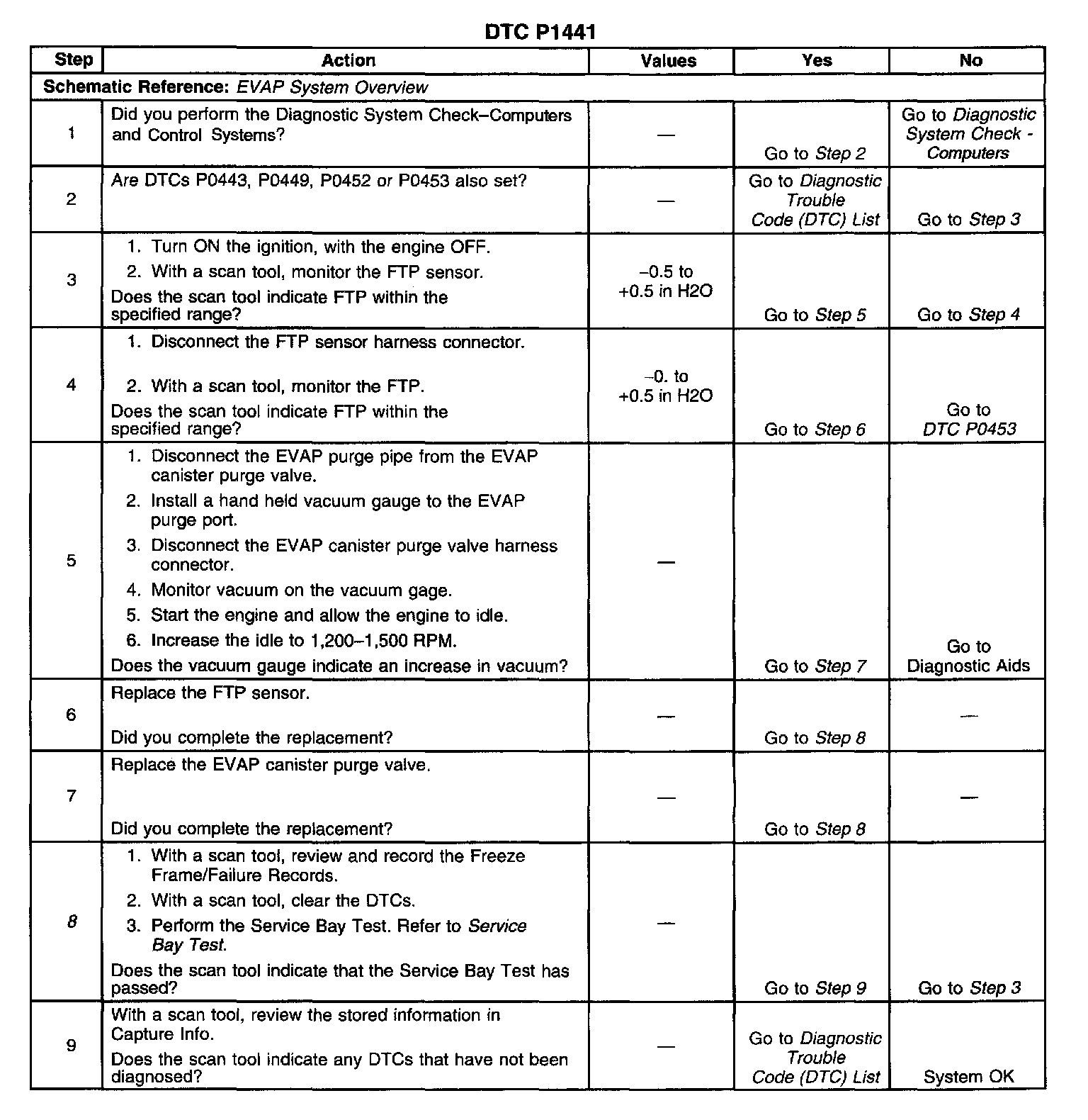 DESCRIPTIONThis DTC tests for undesired intake manifold vacuum flow to the Evaporative Emissions (EVAP) system. The Powertrain Control Module (PCM) seals the EVAP system by commanding the EVAP purge valve OFF, and the EVAP vent valve ON. The PCM monitors the Fuel Tank Pressure (FTP) sensor in order to determine if a vacuum is being drawn on the EVAP system. This DTC will set if the vacuum in the EVAP system is more than a predetermined value within a predetermined time.