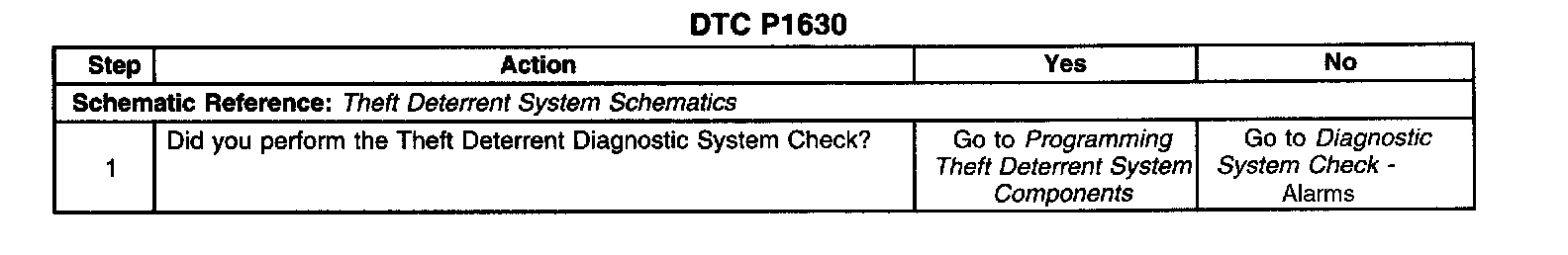 CIRCUIT DESCRIPTIONThe theft deterrent controller (VTD) module produces the theft deterrent fuel enable signal when ignition is ON and the proper transponder key value is detected. The Powertrain Control Module (PCM) monitors the fuel enable signal during crank. If the proper signal is present on the Class 2 Serial Data Circuit, the PCM enables the fuel delivery in order to allow the engine to start. If the PCM is replaced, the replacement PCM should learn the password within a few seconds after the ignition is turned ON. DTC P1630 is an information code indicating that the PCM is ready to learn the theft deterrent password. The engine starts and continues to run with DTC P1630 set.
