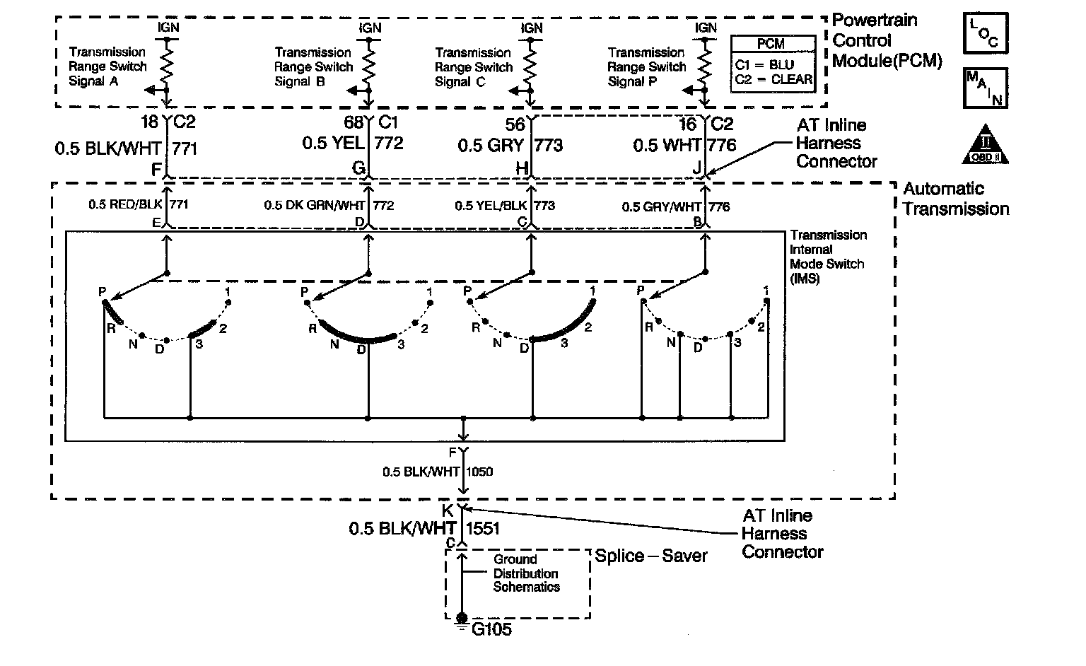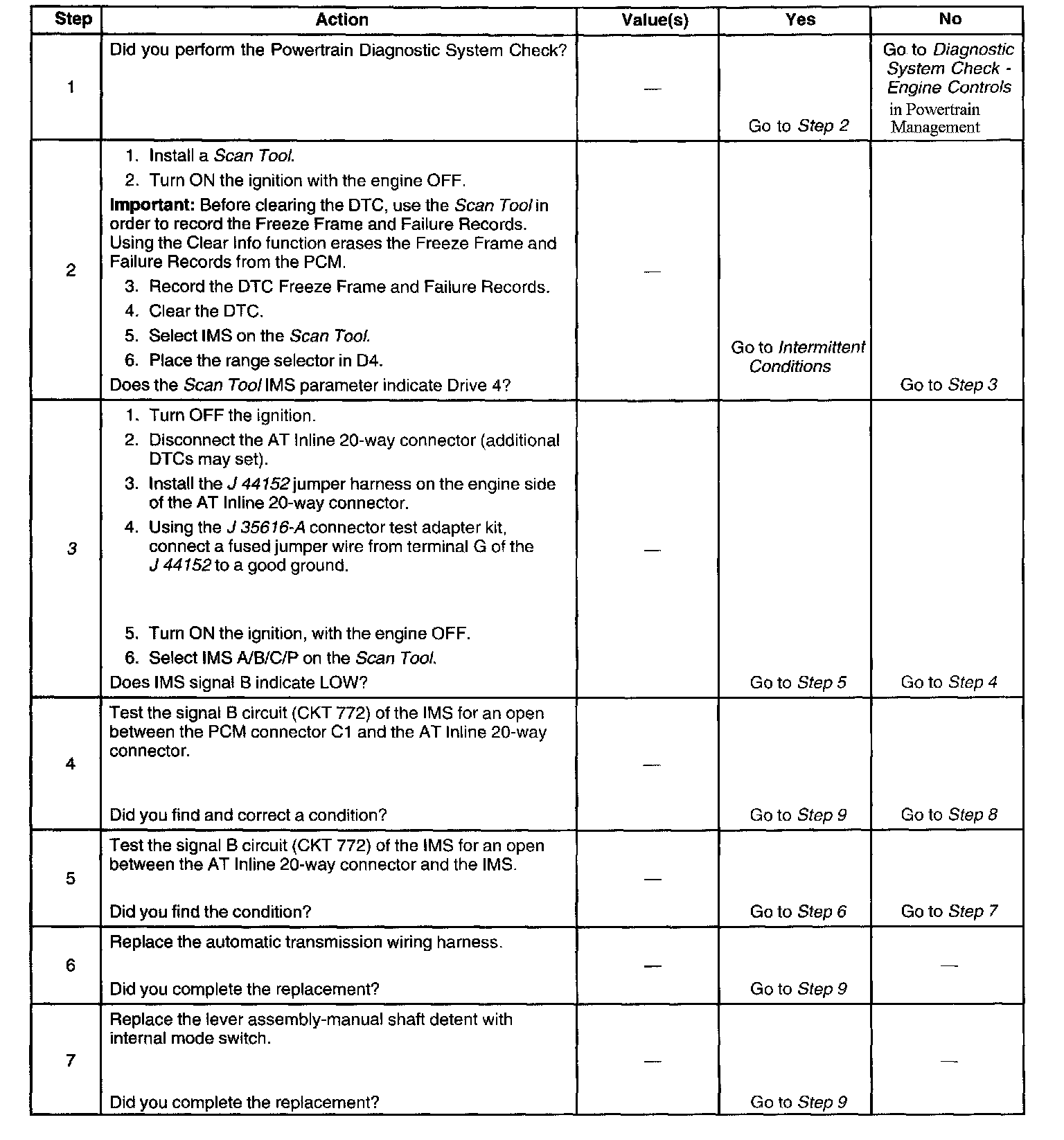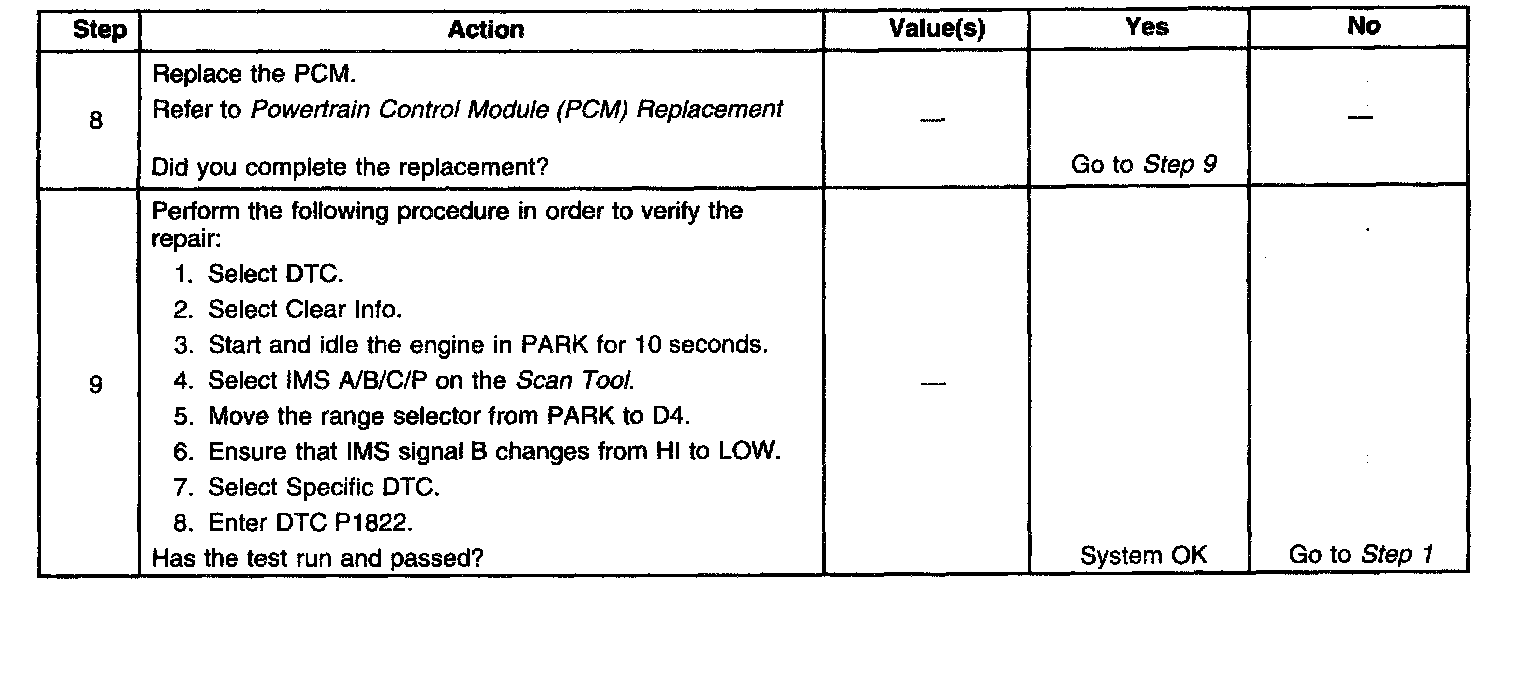 The transmission internal mode switch (IMS) is a sliding contact switch attached to the selector detent inside the transmission side cover. The four inputs to the PCM indicate the position of the transmission range selector. The input voltage level at the PCM is high (B+) when the IMS is open and low when the switch is closed to ground. The four input parameters represented are Signals A, B, C and P (Parity). Refer to Transmission Internal Mode Switch Logic. If the PCM detects that IMS Signal B is always high, then DTC P1822 sets. DTC P1822 is a type C DTC.