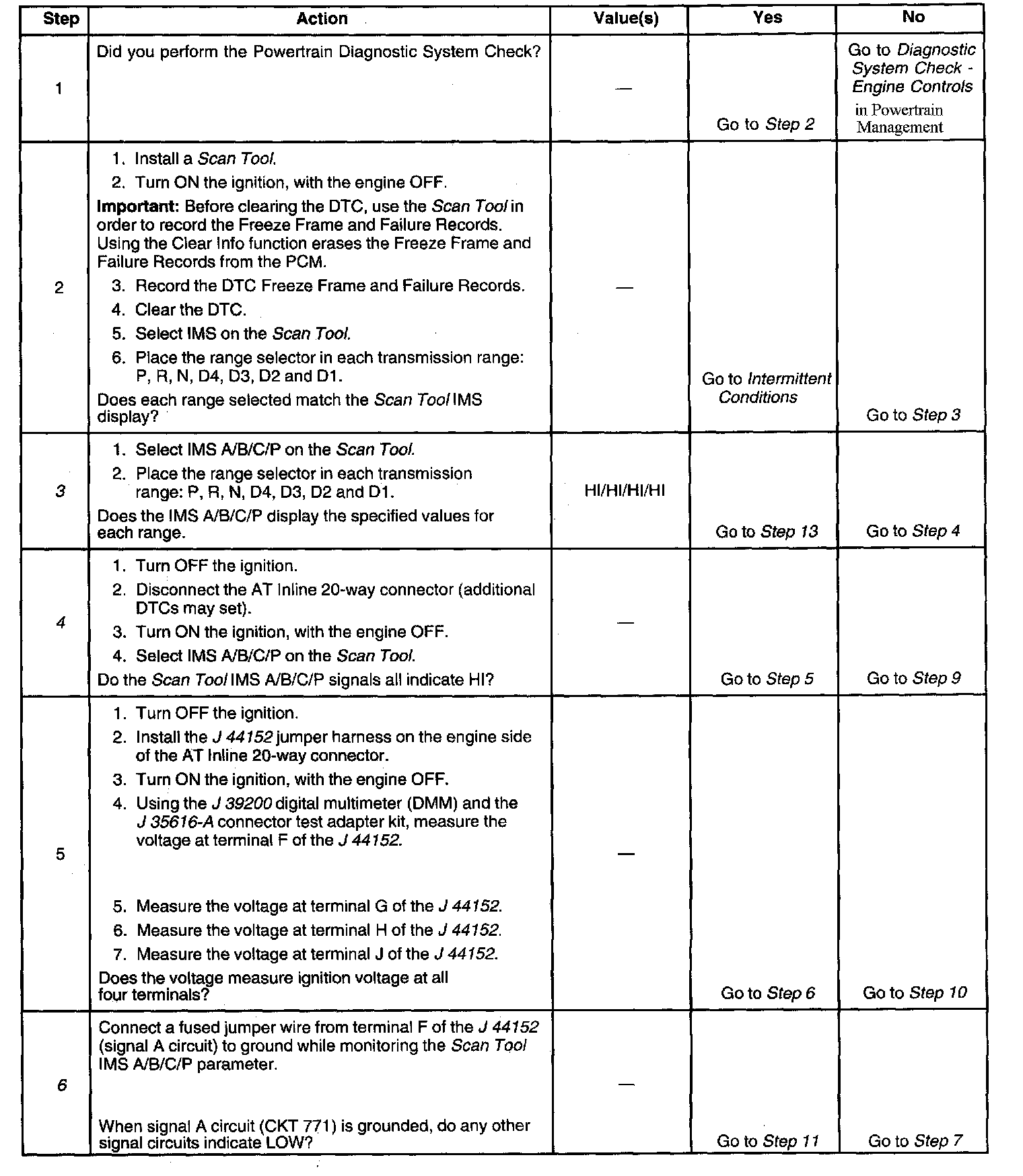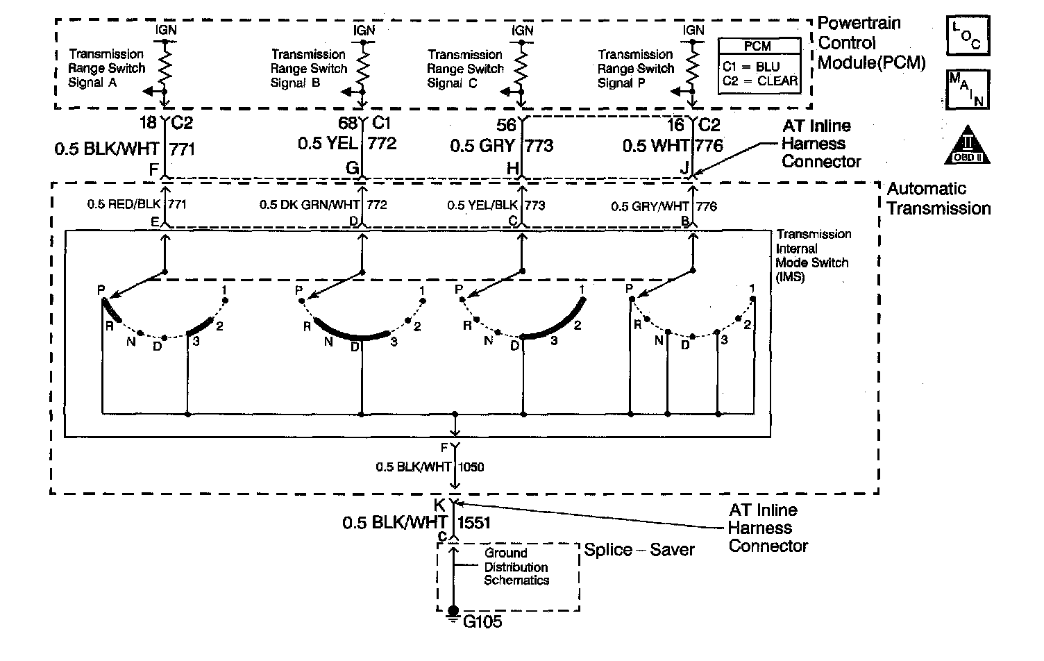 The transmission internal mode switch (IMS) is a sliding contact switch attached to the selector detent inside the transmission side cover. The four inputs to the PCM indicate the position of the transmission range selector. The input voltage level at the PCM is high (B+) when the IMS is open and low when the switch is closed to ground. The four input parameters represented are Signals A, B. C and P (Parity). Refer to Transmission Internal Mode Switch Logic.