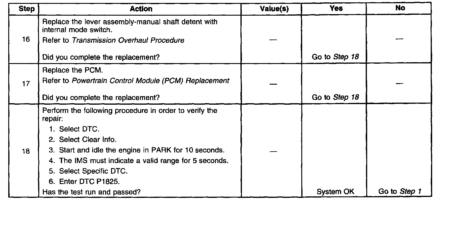 If the PCM detects an invalid transmission range with the engine running, then DTC P1825 sets. DTC P1825 is a type C DTC.