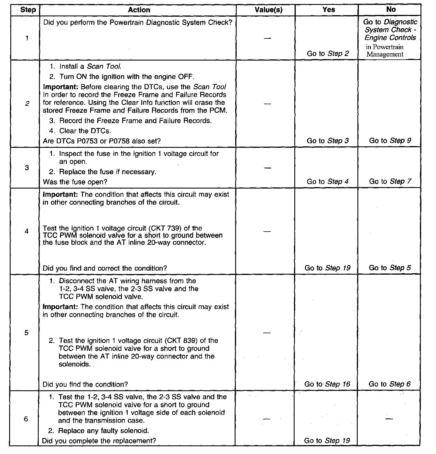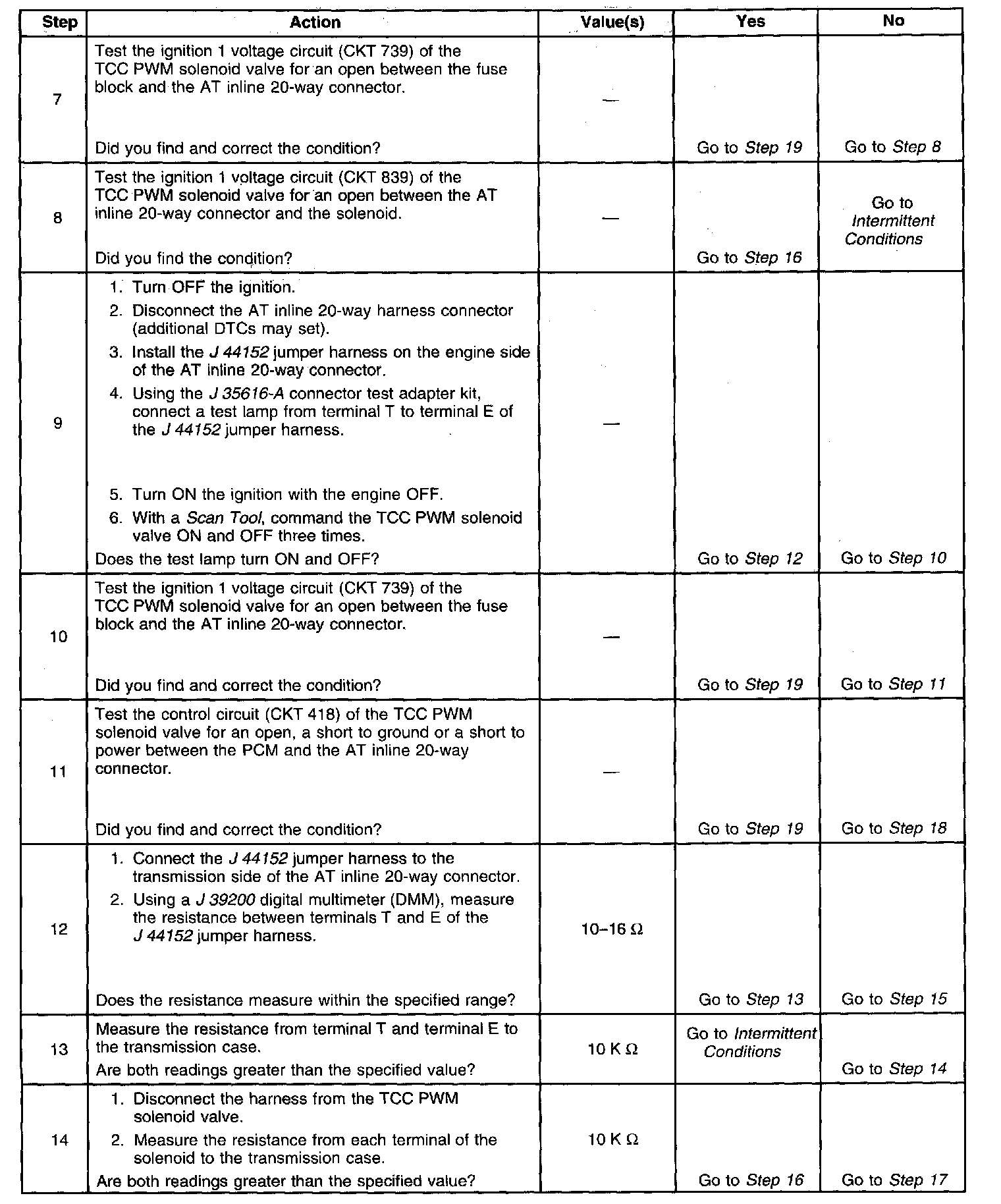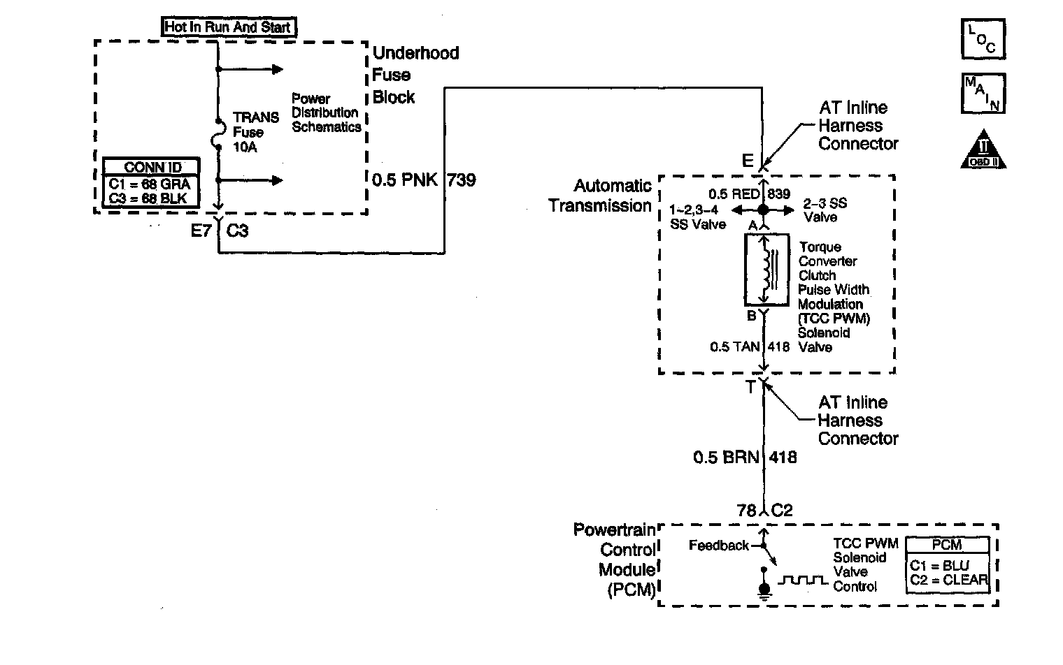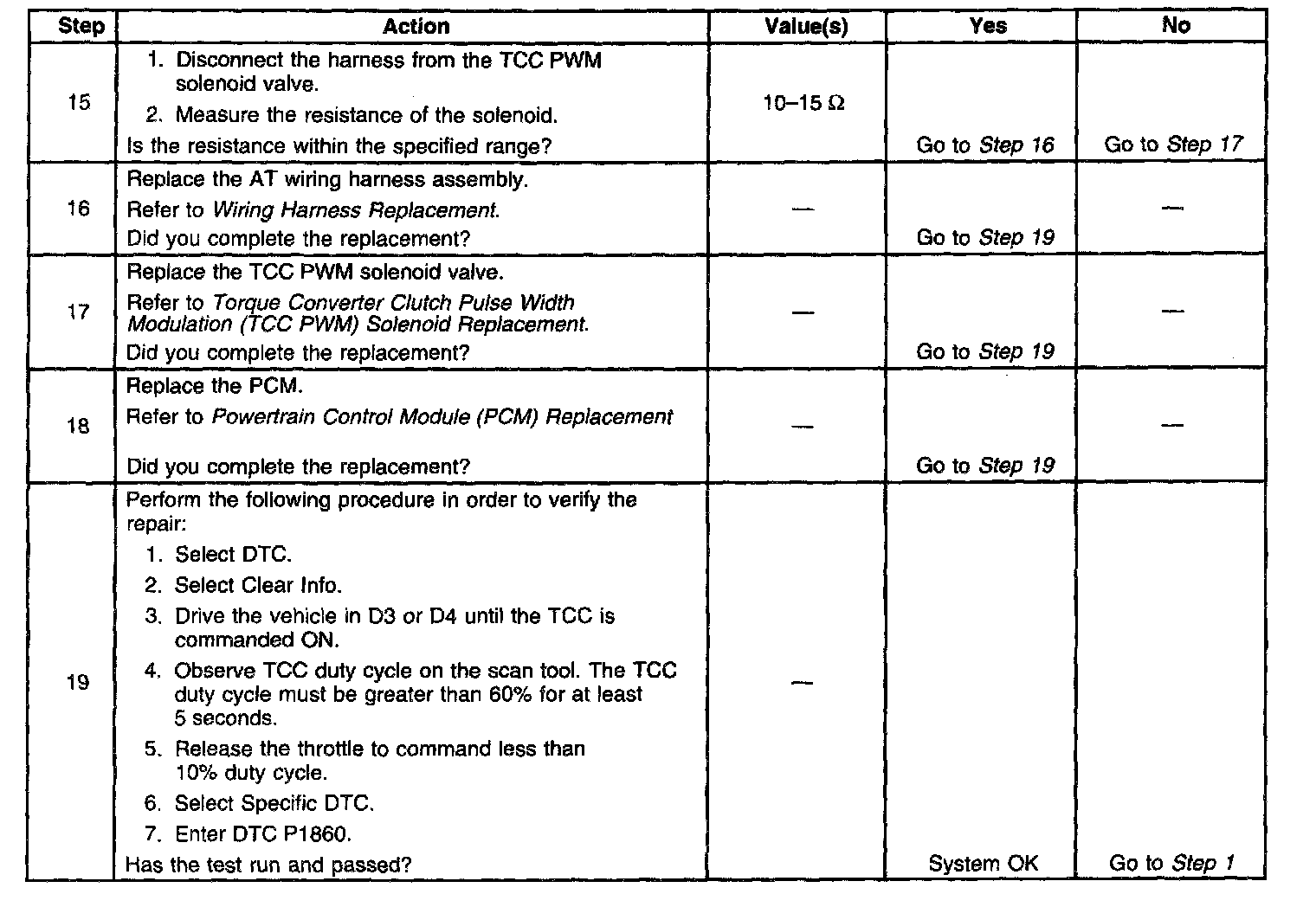 Ignition voltage is provided to the torque converter clutch pulse width modulation (TCC PWM) solenoid valve. The PCM controls the solenoid with a negative duty cycle in order to control application and release of the TCC. When the solenoid is commanded OFF, the PCM senses high voltage. When the solenoid is commanded ON, the PCM senses low voltage.