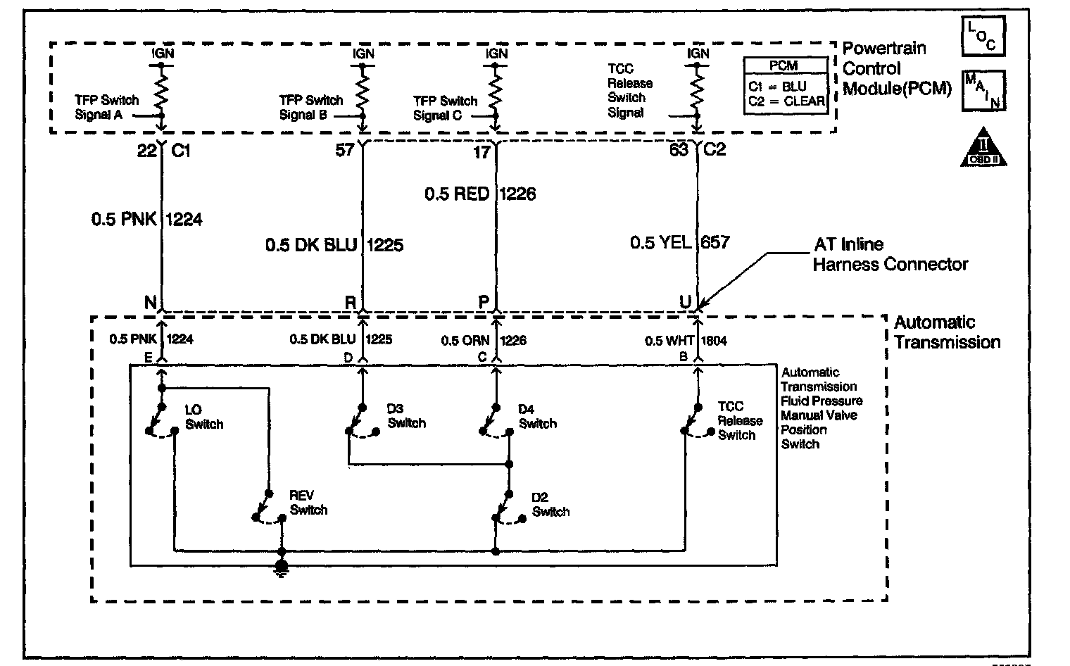 The TCC release switch is part of the transmission fluid pressure (TFP) manual valve position switch. The TFP manual valve position switch is mounted to the transmission valve body. The TCC release switch is normally-closed. The switch signals the PCM that the TCC is released. This is accomplished by torque converter release fluid pressure acting on the switch contact which opens the circuit. When the circuit voltage is high, the PCM recognizes that the TCC is no longer engaged.
