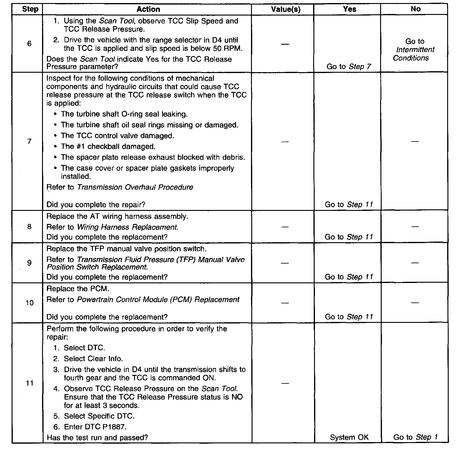 If the PCM determines that the TCC release switch is open (indicating that the TCC is not applied) and the TCC slip speed indicates that the TCC is applied, then DTC P1887 sets. DTC P1887 is a type B DTC.