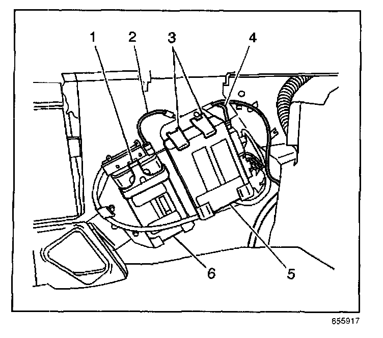 1. Install the OnStar(R) vehicle communication unit (VCU) (6) into the module bracket assembly.