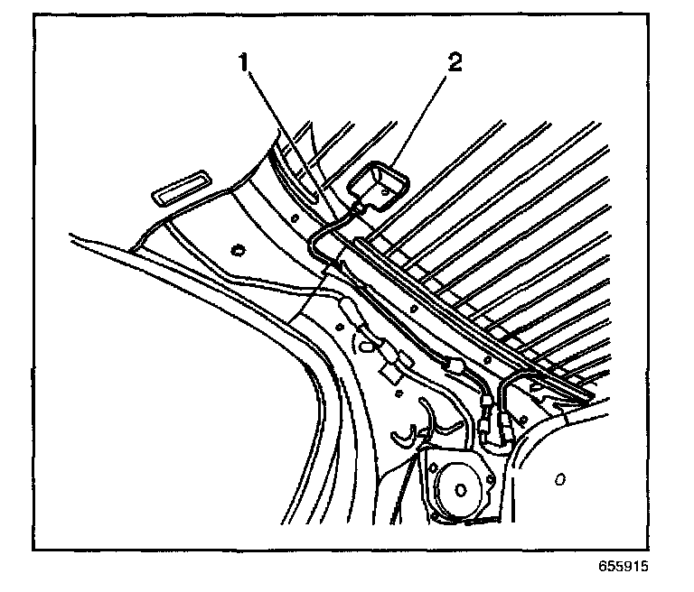 4. Install the new coupling box (2) to the marked location on the interior surface of the rear window with the cellular coaxial cable toward the outboard side of the vehicle.