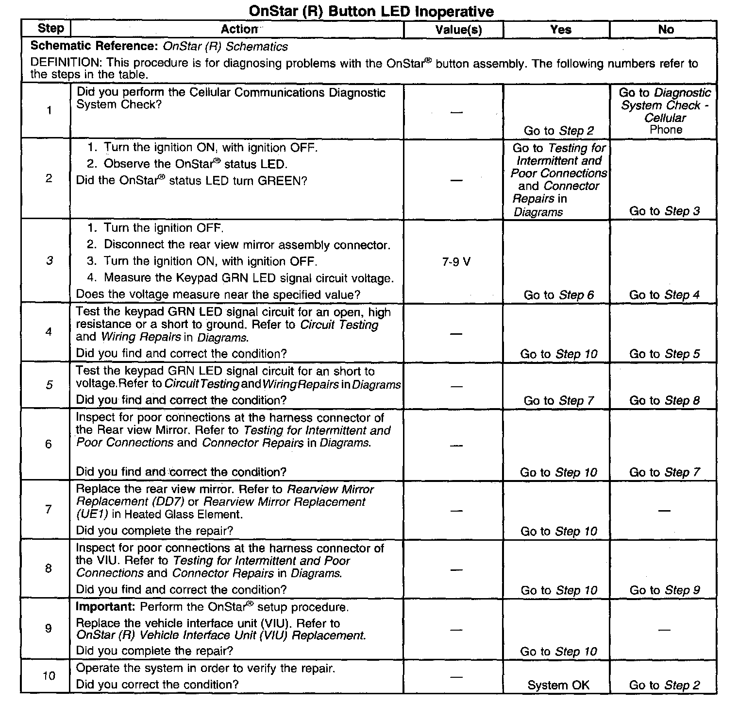5. If the GRN LED signal is shorted to voltage then the OnStar(R) three button assembly has been damaged. The OnStar(R) three button assembly has to be replaced.