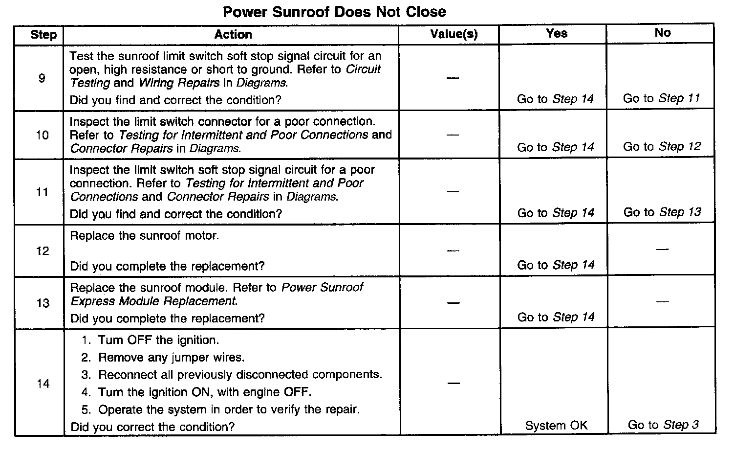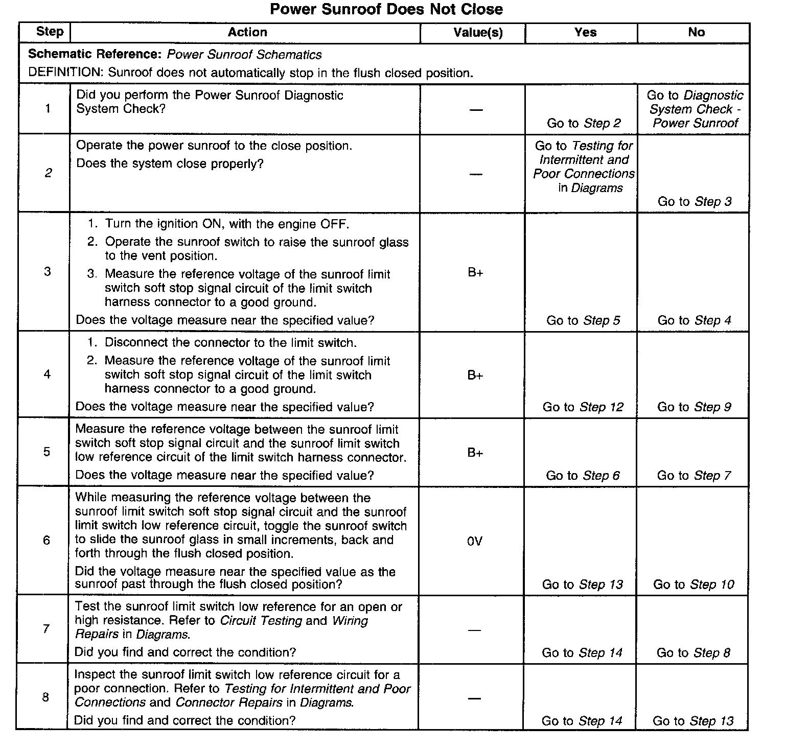 2. If the system does close properly, then suspect either the sunroof limit switch soft stop signal circuit or the sunroof limit switch low reference circuit for a poor connection or intermittent.