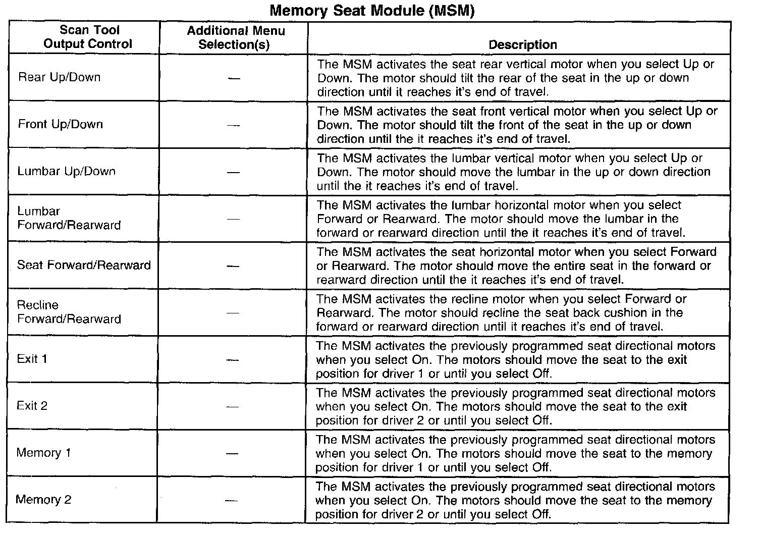 Scan Tool Output Controls - Memory Seat Module (MSM)