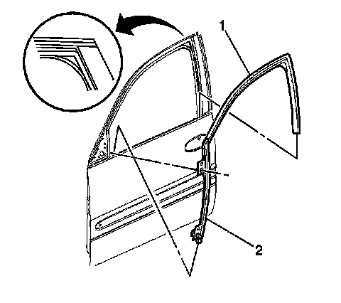 9. Carefully pull the window weatherstrip (1) and channel (2) from the door.