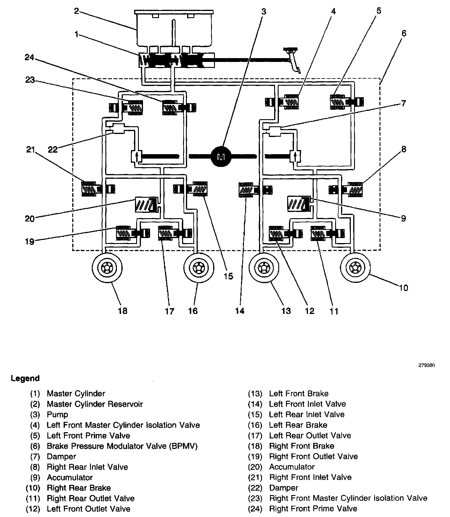 ^ Brake Pressure Modulator Valve (BPMV)-The BPMV contains the hydraulic valves and pump motor that are controlled electrically by the EBCM. The BPMV uses a 4 circuit configuration with a diagonal split. The BPMV directs fluid from the reservoir of the master cylinder to the left front and right rear wheels and fluid from the other reservoir to the right front and left rear wheels. The diagonal circuits are hydraulically isolated so that a leak or malfunction in one circuit will allow continued braking ability on the other.