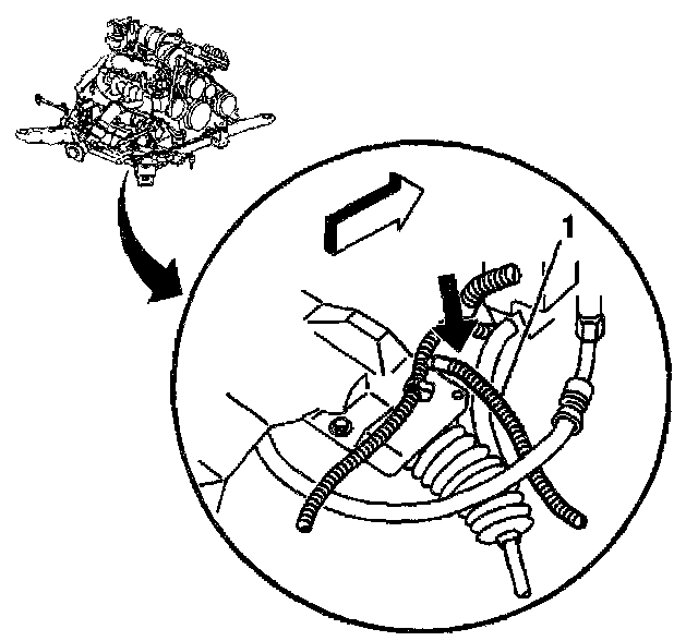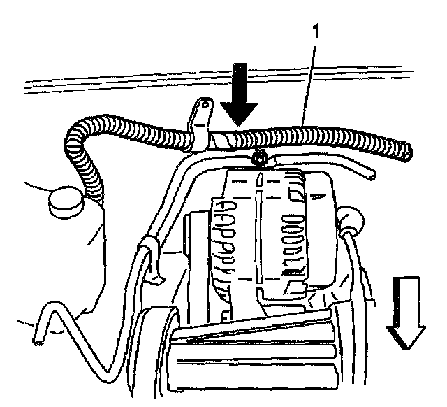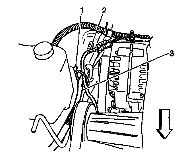 6. Using the strap (1), secure the wheel speed sensor jumper (2) to the Heating Ventilation And Air Conditioner (HVAC) lines (3).