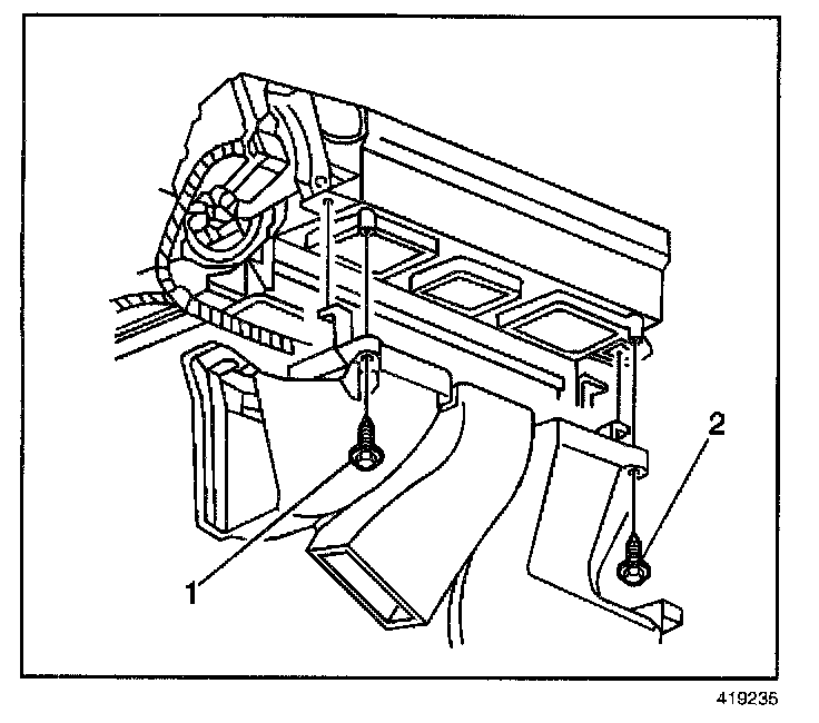 8. Remove the air distributor duct screws (1,2). Due to the difficulty in the removal of the right side screw (2), it will not be necessary to install upon reassembly.