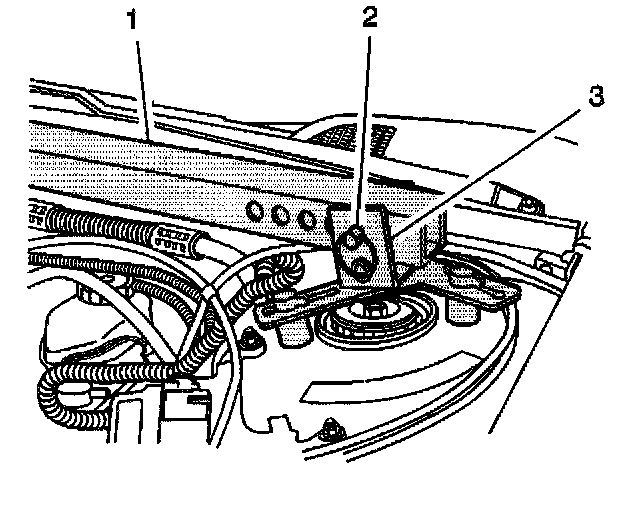 8. Install the 1/2 inch x 2.5 inch quick release pin (J 28467-10) (2) through the strut tower support assembly (J 28467-5A) (3) and the strut tower tube (J 28467-3) (1) on one side only.