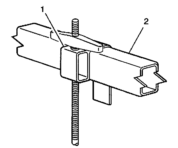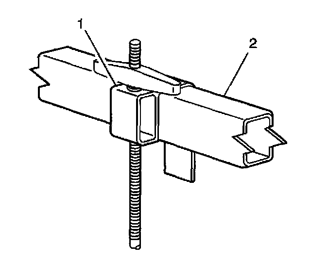 17. Install the assembled lift hook bracket (J 28467-6A) (1) over the strut tower tube (J 28467-3) (2).