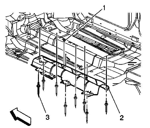 3. Remove the heat shield (2) from the floor panel in the following order: