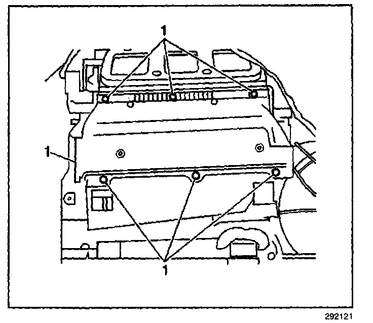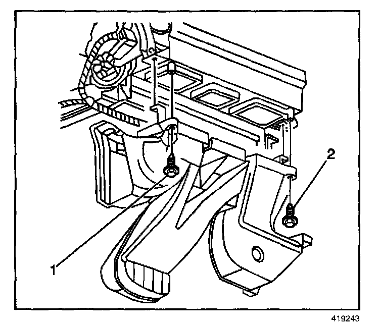 7. Remove the air distributor duct screws (1,2). Due to the difficulty in the removal of the right side screw (2), it will not be necessary to install upon reassembly.