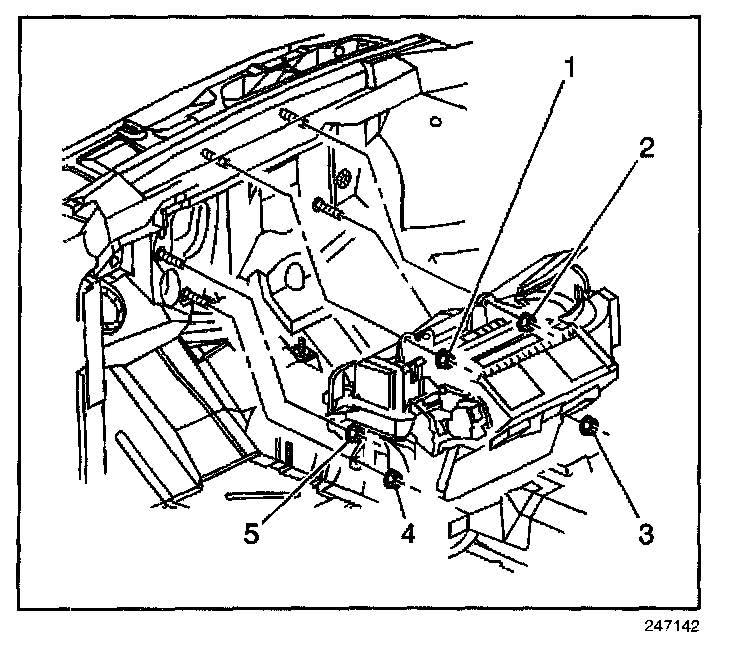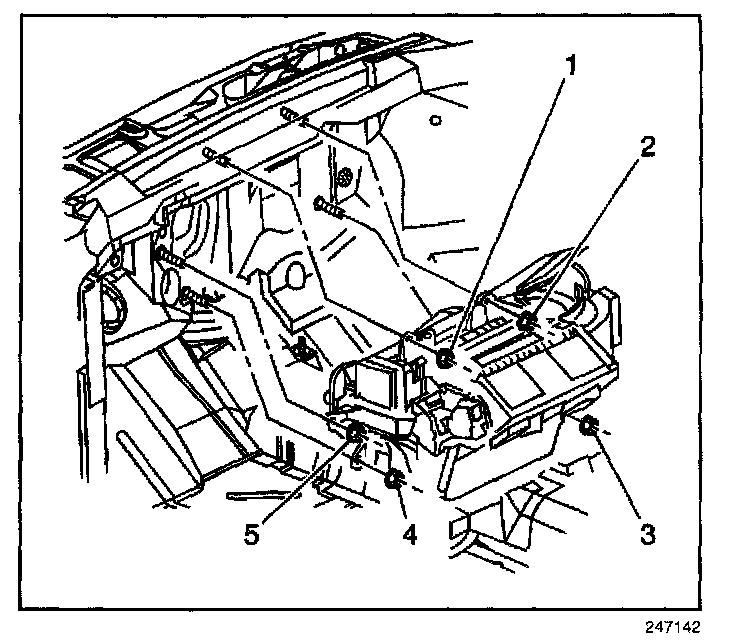 2. Install the HVAC module nuts to the dash (1-5). Refer to the illustration for the HVAC module fastener torque sequence.