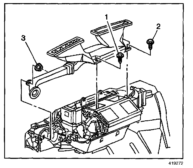 7. Install the defroster duct mounting nut (3) to the front of dash.