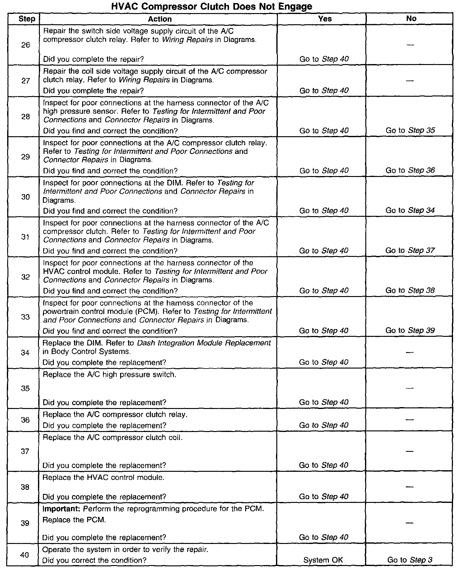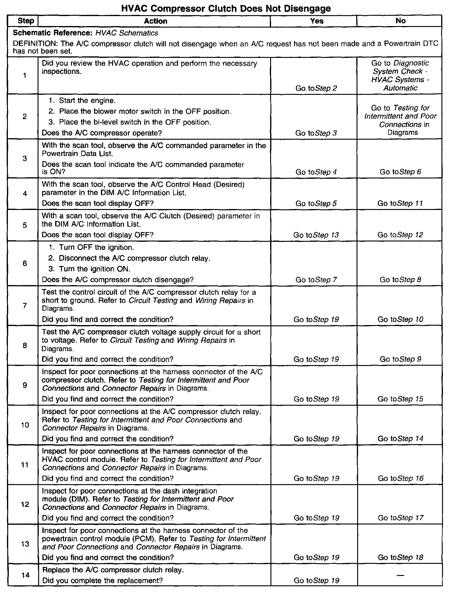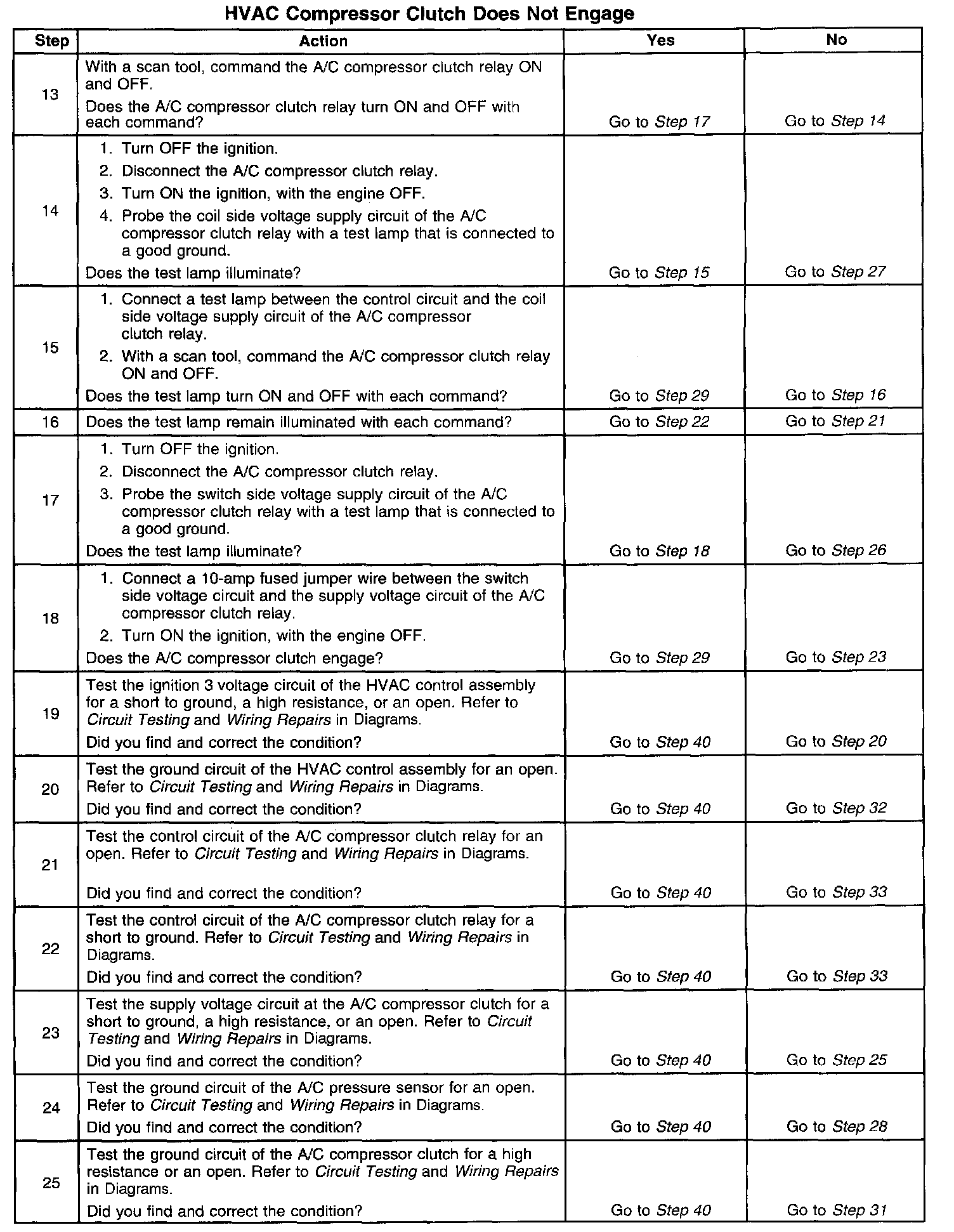 The numbers below refer to the step numbers on the diagnostic table.