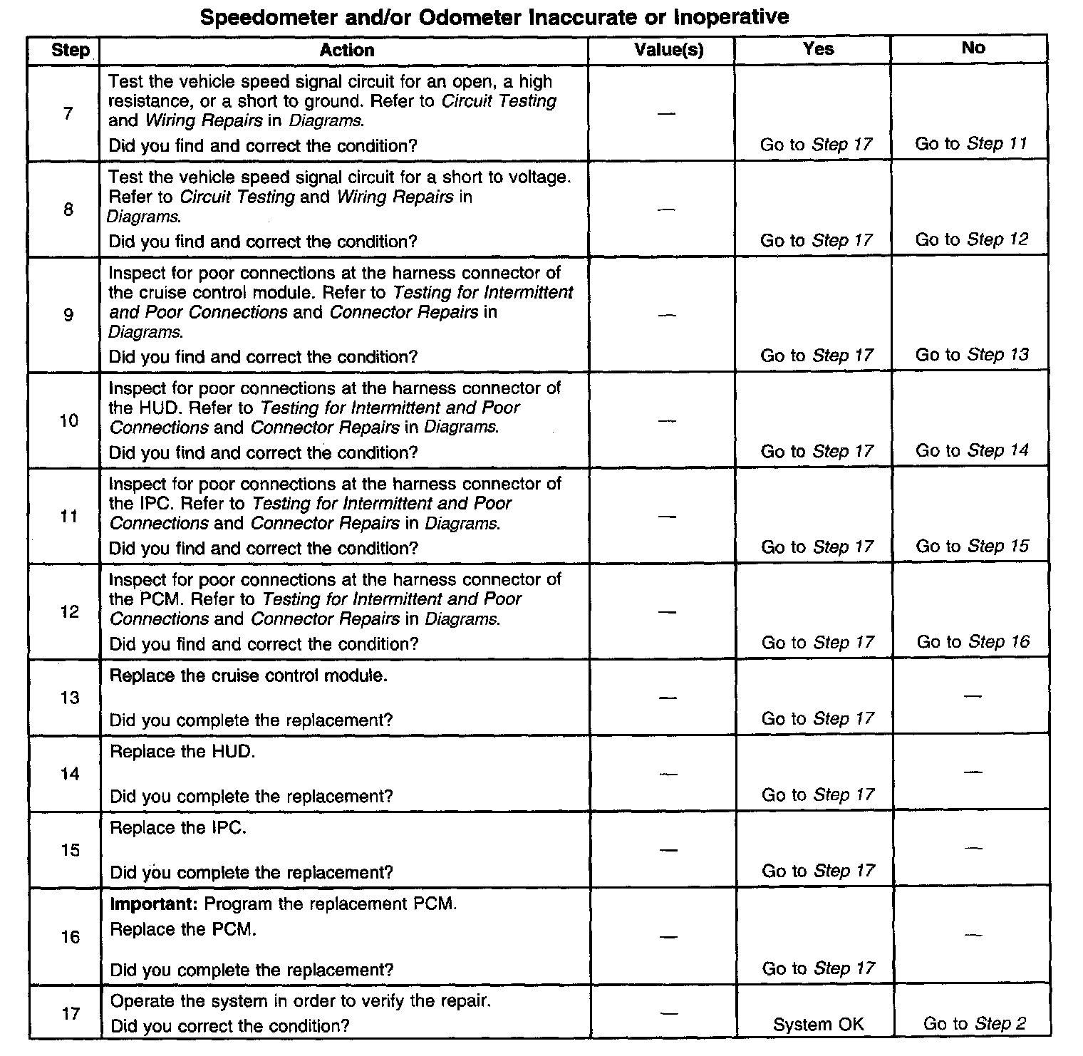 The number(s) below refer to the step number(s) on the diagnostic table.