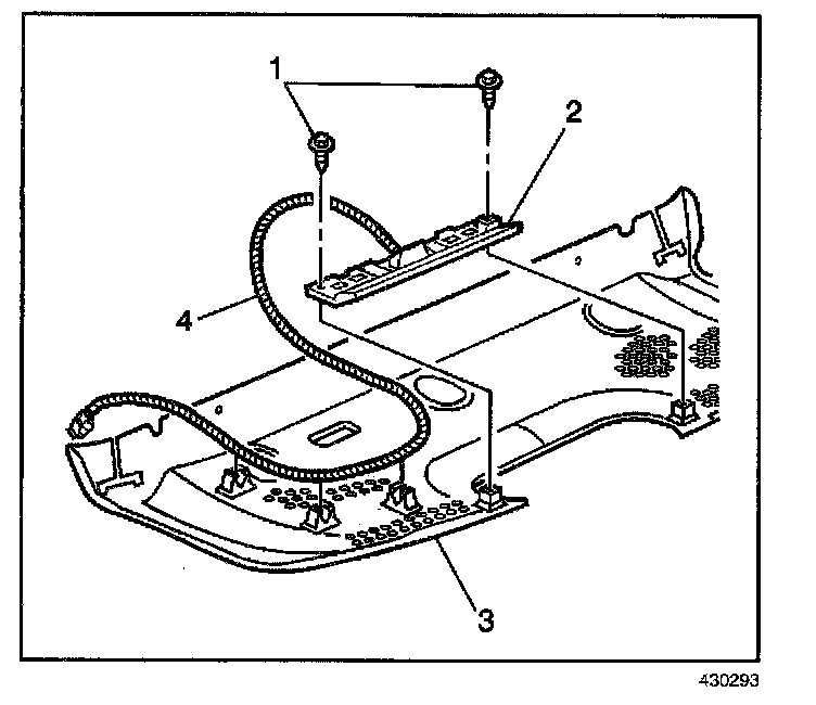2. Install the high mounted stop lamp wiring (4) to the rear shelf panel (3).