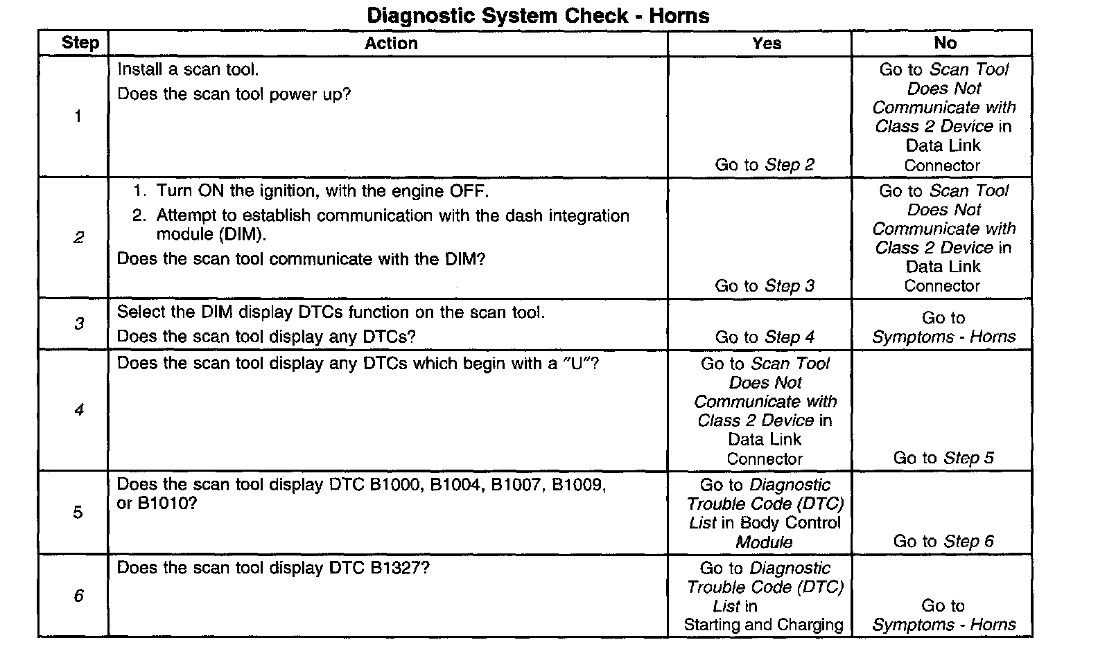 6. At this point you have determined all DTCs applicable to the horn system. Refer to Symptoms - Horns for further horn system diagnosis. Any other codes displayed from the listed modules do not apply to horns and should be diagnosed in the applicable section. Symptom Related Diagnostic Procedures