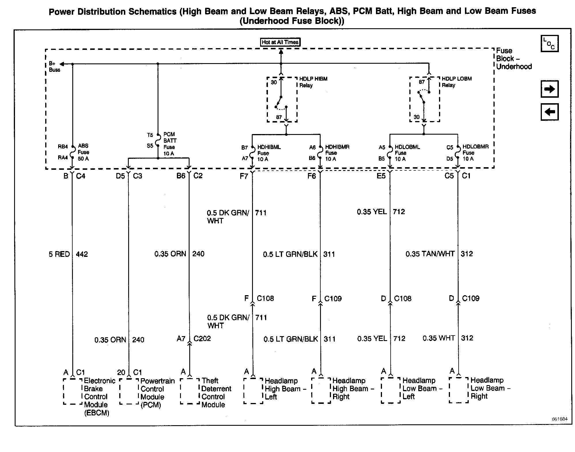 Power Distribution Schematics: High Beam And Low Beam Relays, ABS, PCM Batt, High Beam And Low Beam Fuses (Underhood Fuse Block):