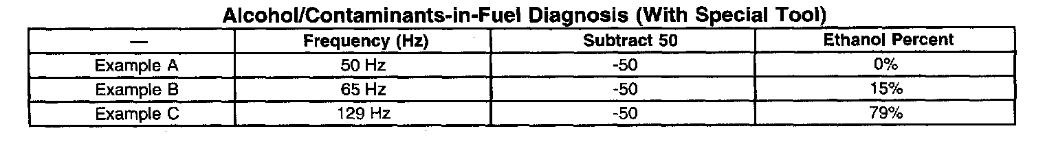 12. Subtract 50 from the reading on the DMM to obtain the percentage of alcohol in the fuel sample. Refer to the examples in the table.