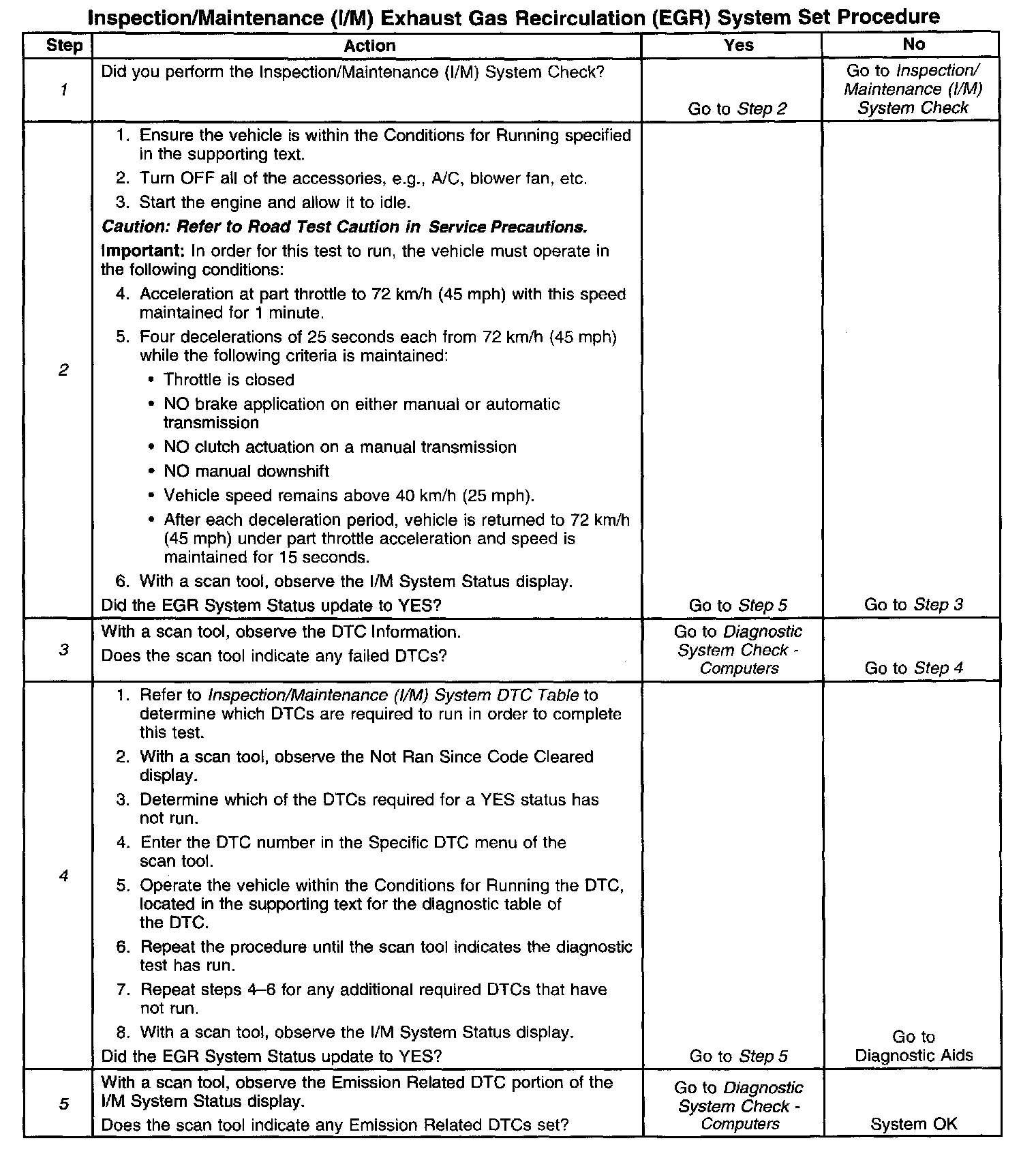 The control module only runs the EGR Active Tests during a gradual deceleration with a closed throttle and a vehicle speed above 40 km/h (25 mph). Several deceleration cycles may be necessary in order to accumulate a sufficient number of EGR flow samples. The procedure outlined in the table is for a clear, flat road. If the procedure is performed on a road with a slight down hill grade, the test may acquire the necessary sample counters in one or two decel trips. If the test is interrupted during the procedure, it may take more than three deceleration cycles to complete the test. If the status does not update, the test outlined in this procedure can be repeated until the I/M System Status updates to YES.