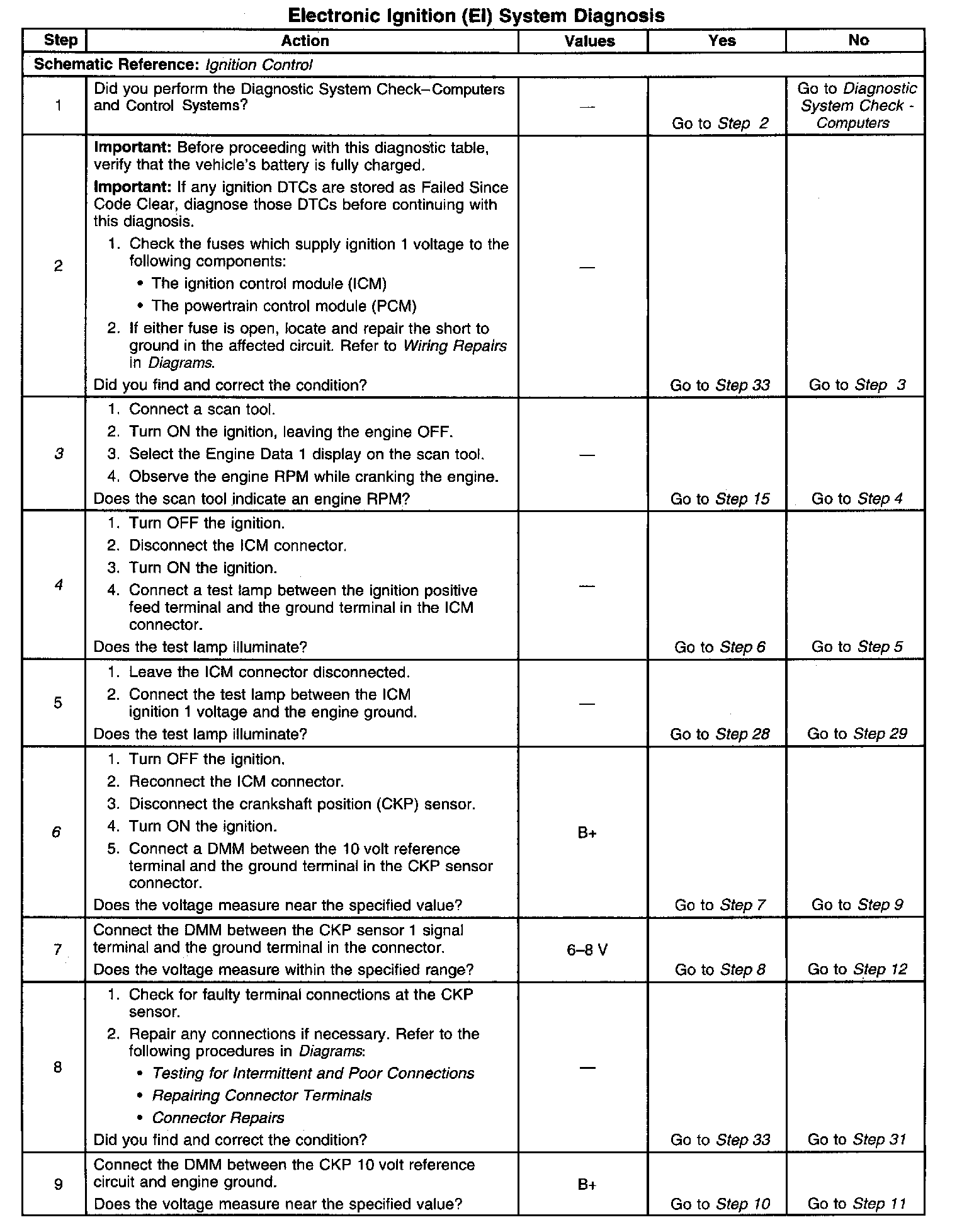 The numbers below refer to the step numbers on the diagnostic table.