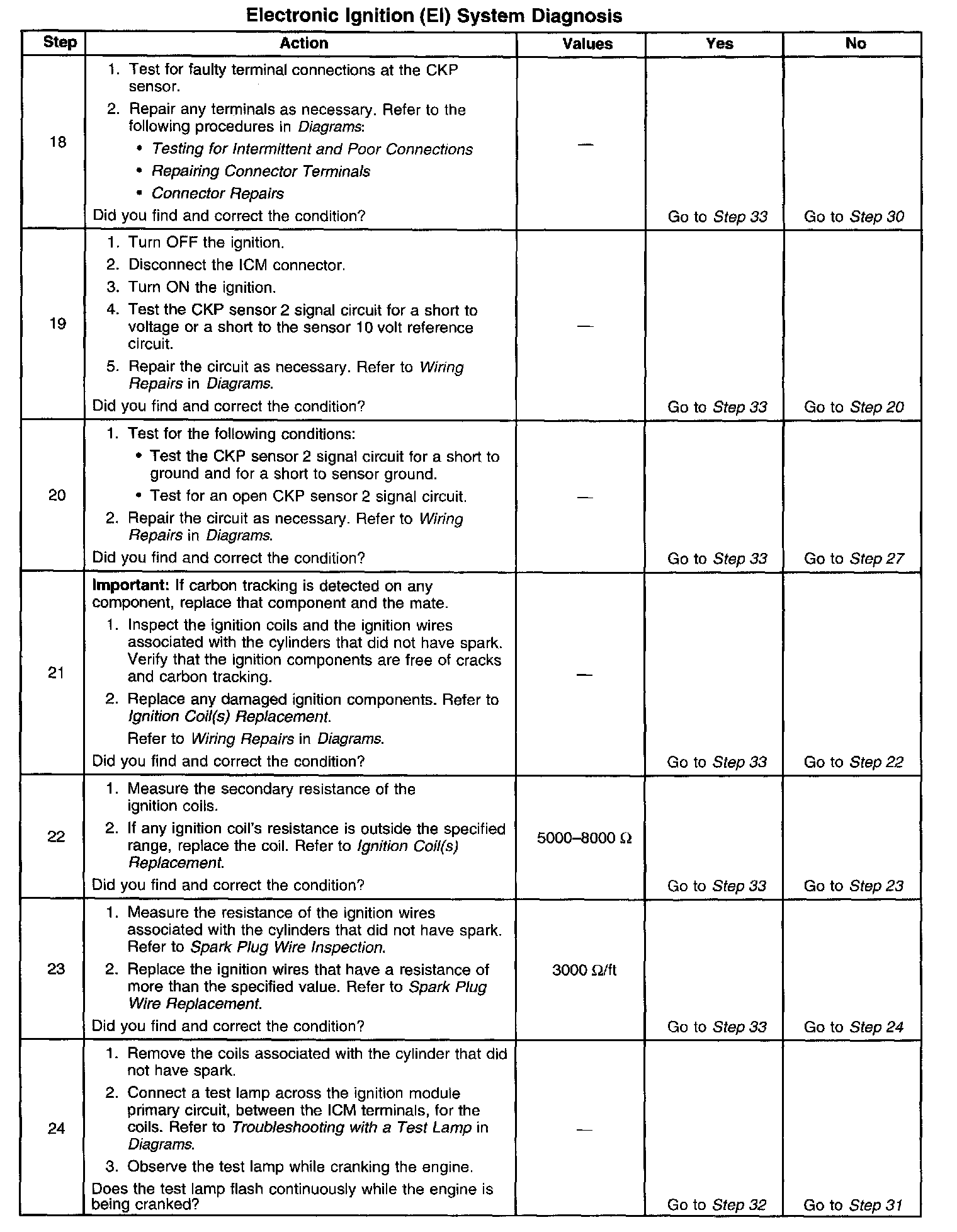26. If the CKP sensor 1 signal and CKP sensor 2 signals to the PCM or the medium resolution and low resolution engine speed signals to the IC module short together the vehicle will not start and run. However, there will be spark and fuel injector pulses.