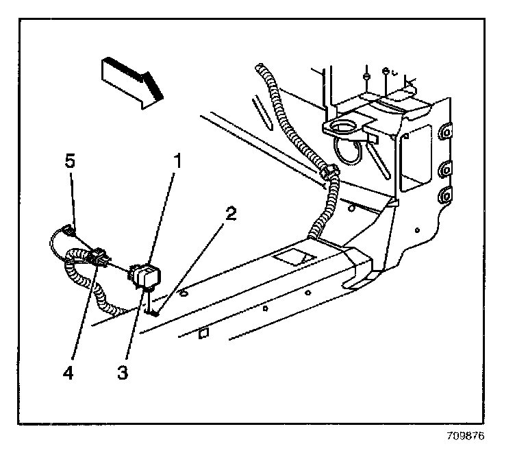 4. Disconnect the inflatable restraint front end discriminating sensor wiring harness connector (4) from the inflatable restraint front end discriminating sensor (1).
