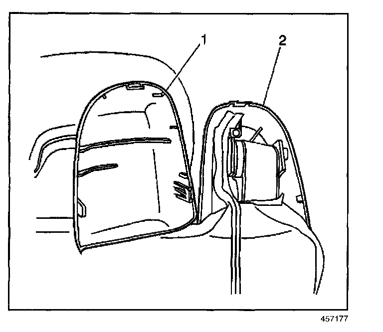 3. Remove the seat belt post rear cover (1) from the front section (2).