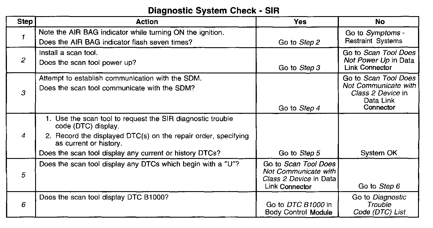 1. Refer to the diagnostic table as directed by a diagnostic system check - SIR. The diagnostic tables will help you to diagnose any SIR system malfunction. Bypassing these procedures may result in the following:
